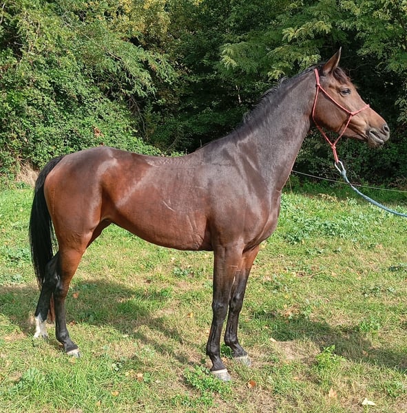 Beautiful Anglo-Arab mare, dark bay, 16.3 hh at the withers. A rare beauty, very people-oriented, with a good temperament. She is trained in all three gaits and is ridden outdoors alone or in company. In 2025, she qualified three times for the SHF 20 km endurance rides. She is also introduced to jumping. This mare possesses many physical qualities and can suit a variety of disciplines.