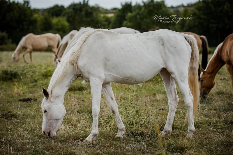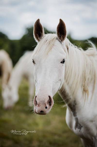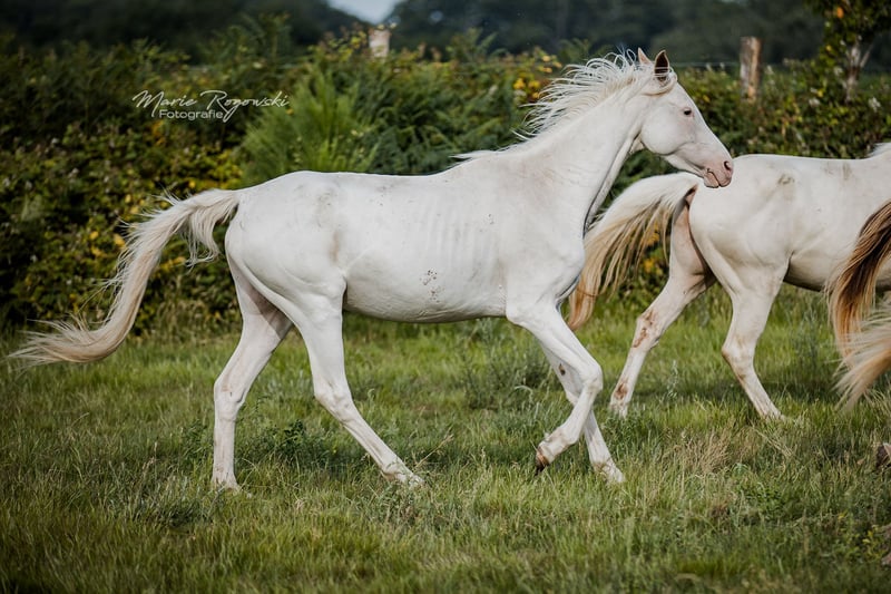 Anglo-Araber-Stute | geb. 2020 | Endmaß ca. 165 cm erwartet Genetik: W19, W20, Frame Overo (OLW) | n/P2, n/P4 SHE`s ALL WHITE ist eine genetische Besonderheit: Sie trägt gleich drei dominante Weißmuster ? W19, W20 und Frame Overo (OLW) - und wurde nahezu vollständig weiß geboren. Die genetische Grundfarbe ist nicht bekannt, ihre Erscheinung jedoch spektakulär. Sie zählt zu den wenigen bekannten vollständig weißen Anglo-Arabern weltweit. Ihr Vater ist leistungsgeprüft und gekört, ihre Mutter bringt Typ und Format aus bewährter Anglo-Araber-Zucht mit. Der Vollbruder von 2018 hat sich auf etwa 165 cm entwickelt - ein ähnliches Endmaß wird auch bei ihr erwartet. Mit ihrer seltenen genetischen Kombination ist sie interessant für farborientierte Zuchtprogramme - sowohl im Anglo-Araber-Bereich als auch bei Warmblütern mit Araberblutanteil. Farblich ist sie besonders wertvoll für die Vererbung von White Spotting-Varianten, inklusive Frame Overo. Sie ist eine sensible, eher zurückhaltende Stute, die neugierig auf den Menschen reagiert, jedoch Zeit und Feingefühl braucht, um Vertrauen zu fassen. Im Umgang zeigt sie sich aufmerksam und intelligent.
