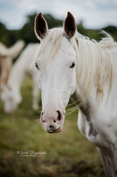 Jument anglo-arabe | née en 2020 | taille adulte prévue : environ 165 cm Génétique : W19, W20, Frame Overo (OLW) | n/P2, n/P4 SHE`s ALL WHITE présente une particularité génétique : elle porte trois motifs blancs dominants ? W19, W20 et Frame Overo (OLW) - et est née presque entièrement blanche. Sa couleur génétique de base n'est pas connue, mais son apparence est spectaculaire. Elle fait partie des rares Anglo-Arabes entièrement blancs connus dans le monde. Son père est testé et approuvé, sa mère apporte le type et le format d'un élevage Anglo-Arabe éprouvé. Son frère germain né en 2018 a atteint une taille d'environ 165 cm - on s'attend à ce qu'elle atteigne une taille similaire. Avec sa combinaison génétique rare, elle est intéressante pour les programmes d'élevage axés sur la couleur, tant dans le domaine anglo-arabe que chez les chevaux à sang chaud avec une part de sang arabe. Au niveau de la couleur, elle est particulièrement précieuse pour la transmission des variantes de white spotting, y compris le frame overo. C'est une jument sensible, plutôt réservée, qui réagit avec curiosité envers les humains, mais qui a besoin de temps et de délicatesse pour gagner en confiance. Elle se montre attentive et intelligente dans ses interactions.