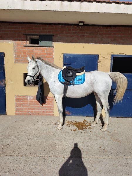 Seven-year-old Anglo-Arabian mare for sale. Height: 1.57 m. Her sire is the purebred Arabian Irwin LC, and her dam is Gazal Mirza, a Hungarian purebred Arabian. Passported. Raised in a family environment. Very gentle and affectionate, ground manners excellent. Walk, trot, and canter. Light-footed, lively yet very calm. Starting work on the arena and crossing poles. No vices or bad habits. Completely healthy. Has great potential for improvement with some training, as she learns very quickly. Available for viewing and testing in Madrid, in the San Sebastián de los Reyes area.