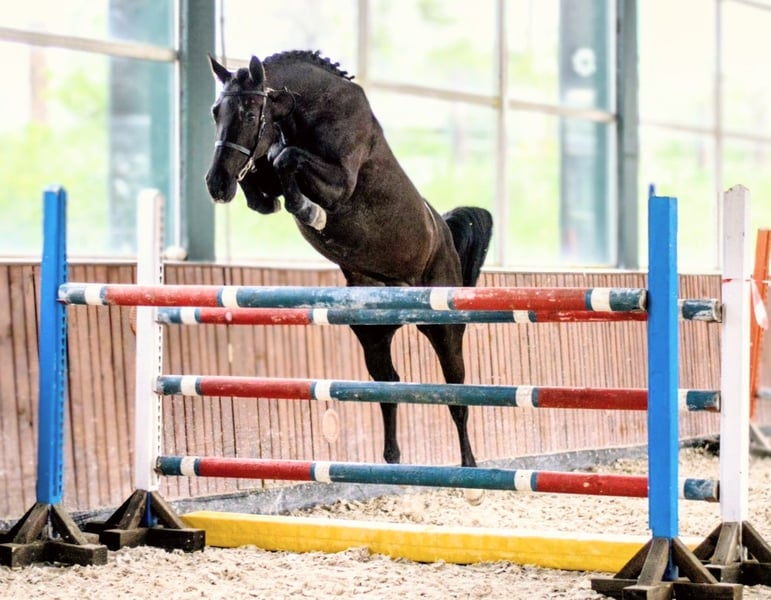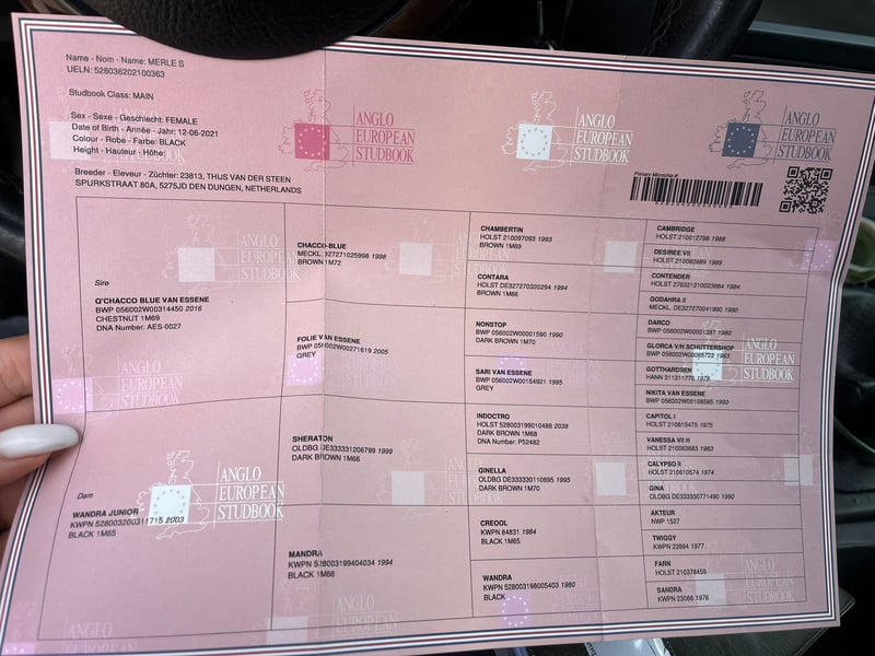 💥Are you ready to take off? "Merle S," a superlative young horse, is looking for her FOREVER HOME... She seeks a home where her high-quality nature is appreciated and where she will NOT be used as a sport tool. She wants to live a horse-appropriate life – with pasture, paddock, etc. Of course, she should continue to be developed in sports, as she has the best prerequisites for the big tour. This granddaughter of "Chacco Blue" has an extraordinary jumping ability with excellent manners, leaving nothing to be desired. She is easy and light to ride, neither crazy nor does she get hot in the course. Merle is always 100% with her rider. She is currently jumping about 1.20m under saddle. She has a pleasant go, wants to avoid mistakes, and is a winner type. Merle is still inexperienced but feels great to ride. No stops, no refusals. Last month, she also stepped onto the winner's podium with 2 competition starts. Overall, a high-quality horse of the finest kind and absolutely reliable. She goes very well out on trails, whether alone or in a group. Of course, the price reflects her quality. Her pedigree needs no words and speaks for the highest quality of this beautiful black mare.🤩 This filly is also highly interesting for breeders. If you like this exceptional horse, please contact me with your phone number so I can get in touch with you as soon as possible.
