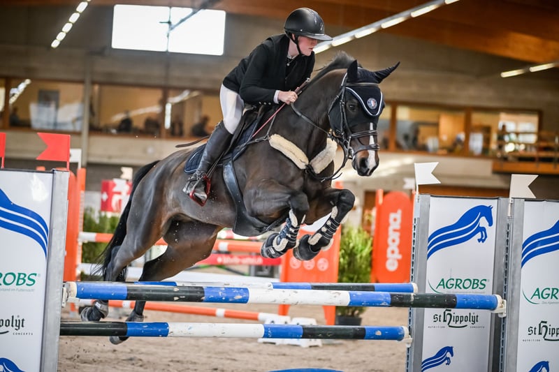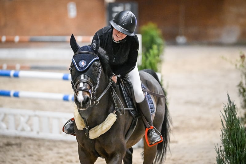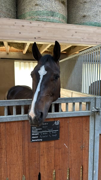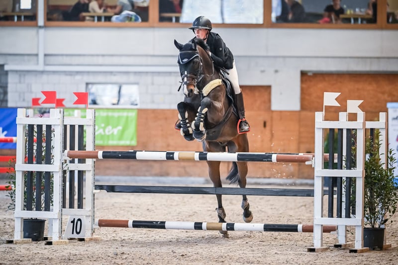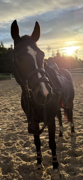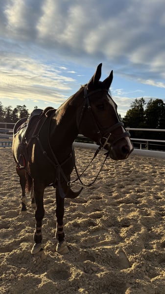 The 11-year-old, dark bay gelding "Hidden Bisous" is available. At home, Bisous is very well-behaved and affectionate in handling. He is confident in the terrain, whether in a group or alone. He has no issues in traffic, with tractors, or chainsaws. In dressage, he masters all basic exercises but tends to be a bit more spirited, often requiring gentle reminders, as he is quite lively. However, he calms down after the first canter. In jumping, Bisous is always highly motivated, approaches the fence pleasantly, and consistently clears from any distance. He has already gained experience up to 120 cm classes but can be somewhat cautious above 115 cm. Therefore, he is suitable for someone looking to establish themselves in show jumping and work towards a license. Please send a private message if interested.