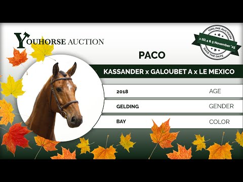 De zevenjarige Paco heeft concourservaring op 1.20m niveau. Hij springt met veel kwaliteit en heeft een groot hart. Een echte meewerker met een top techniek van springen. Hij wil erover en houdt van het spelletje. Vader Kassander van ’t Roosakker (1.40m springen) is één van de twaalf internationaal springende nakomelingen uit Electra van ’t Roosakker (1.60m Grand Prix) Moeder Idyllic II (Galoubet) bracht de 1.55m Grand Prix-hengst Cheese W Z en komt uit de bekende Le Mexico-dochter Adith, die in het verleden met Hap Hansen op 1.60m niveau sprong en zeer waardevol bleek voor de fokkerij. Adith leverde 14 nakomelingen die (inter)nationaal springen. Daaronder de hengst Daredevil, Here and Now en Glad Tidings. Adith’s moeder Plegtje is een zus van het olympisch springpaard Van Gogh (Willi Melliger).