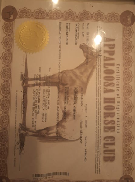 Zum Verkauf steht ein Few Spot Junghengst mit dem Namen: BK Legacy of Geronimo. BK Legacy of Geronimo wurde auf der Zuchtschau 2023 prämiert (siehe Bild 3; Bild vom Züchter), LG I, Wertnote: 9,3. Braun LP/LP. Geschätztes Endmass 151 cm. "Ronny" ist sehr Menschen bezogen Junghengst, kennt das Fohlen ABC, Bodenarbeit und wurde mit Pad anlongiert. Er geht an der Hand entspannt ins Gelände und zeigt sich in neuen Situationen sehr souverän. Sein Vater ist Ima Sioux Olena (siehe Bild 4; Bild vom Züchter), ein gekörter Hengst und seine Mutter ist Roxys Lady in Dark, ihre gesamte Nachzucht ist prämiert. Also ein sehr interessanter Junghengst für Zucht und Sport. Geimpft und Entwurmt. Dabei: COR und Equitenpass vom APHCG. Wegen Änderungen der Lebensumstände wird der Junghengst unter Wert verkauft!
