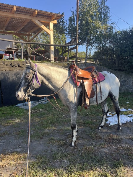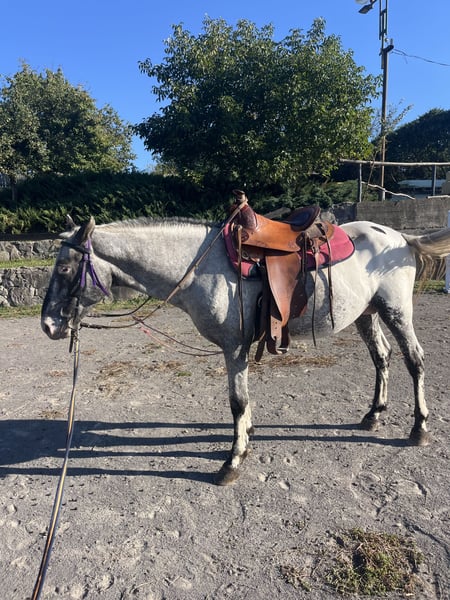 **Elegant Black Appaloosa Stallion – Born 2021, 155 cm, Western Riding** We are pleased to offer this striking black Appaloosa stallion, born in 2021, standing at 155 cm. With his distinctive coat pattern and charismatic presence, he is an eye-catching addition to any equine program. This well-built young stallion has a promising foundation in Western riding disciplines. His temperament is calm, confident, and well-mannered under saddle, making him suitable for riders looking to develop a versatile Western horse. He is well-ridden and has shown good responsiveness and willingness to work. His conformation is balanced, with correct movement and a strong, athletic build. His striking appearance and solid temperament make him an excellent prospect for both competitive Western riding and as a future breeding stallion for those interested in Appaloosa bloodlines. This promising young stallion is ready to continue his training with a dedicated rider or trainer. His unique combination of conformation, temperament, and striking appearance makes him a valuable addition to any equine enthusiast’s stable. For more information or to arrange a viewing, please contact us. We look forward to presenting this exceptional Appaloosa stallion to you! ---