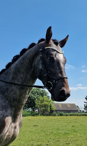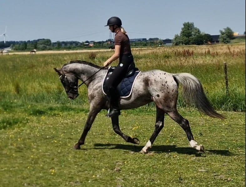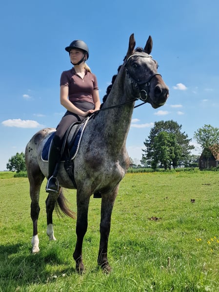 This appaloosa bred by ourselves is a special appearance. With his different color and very fine and smooth spacious movement. Is finely trained and easy to ride. Is still a stallion, but easy to handle, well behaved, very sweet and people-oriented. Wants to work for you! Bred from very fine dressage bloodlines. Sire is the 1st premium Keur and Prestatie Sport Peru's First Class, also Dutch Champion. Mother has obtained the Sport predicate. In the dressage bloodlines the very proven famous stallions Krack C, Jazz and Sir Donnerhall. And that combined with appaloosa blood what gives him this beautiful shiny color. For a change we also did some jumping, he likes this too. Which can also make him a suitable all-rounder. Has always had a lot of free movement and been in group rearing. Never had any defects or injuries. Falls in higher price category. Please contact us if interested.