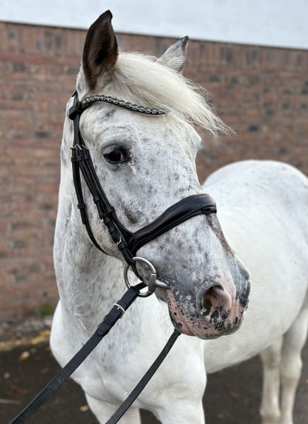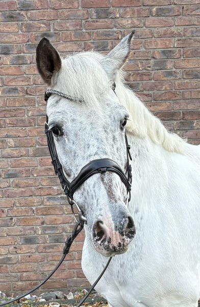 Pinta is a strikingly marked 11-year-old mare with a passport. She stands approximately 1.55 meters tall and has a sturdy build. She is used in our riding school both on the lunge line for beginners and more advanced riders. She is social with other horses and is accustomed to both box and open stall housing. Currently, she has four shoes but can also go barefoot. She is familiar with riding out and riding with side reins. Pinta offers a comfortable seat and is always easy to get moving. No health issues are known. Tack can be purchased separately for an additional fee.