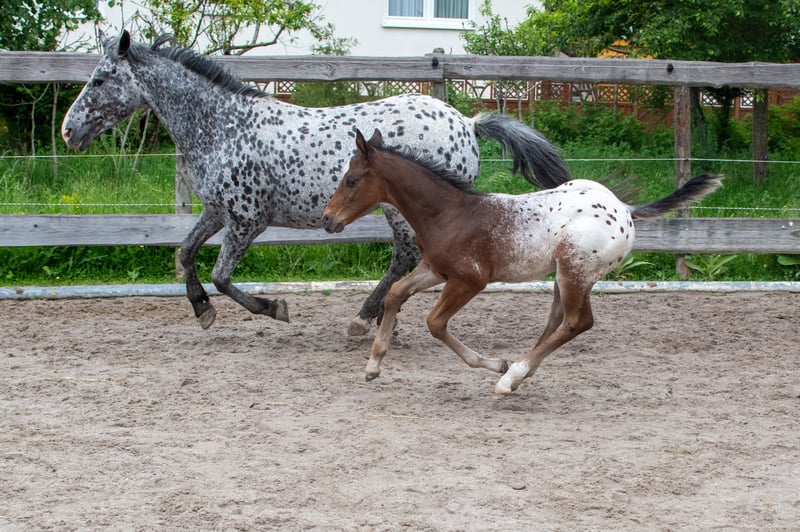 Kates a Star, surnommée Kati, est une descendante de "Toby 1", provenant donc de la célèbre lignée Toby. Elle a été montée pendant la période où elle n'était pas pleine et n'avait pas de poulain à ses côtés. Kate est une excellente mère et est à nouveau pleine de Buns Final Chief. Son dernier poulain (voir les photos) est un Buckskin ; avant cela, elle a eu un Schabrackentiger et encore avant, un Tigerschecke. Elle transmet donc - selon le cheval de reproduction - des couleurs variées. Elle a des pieds très sains, est ferrée et chargée sans problème, et est très agréable à manipuler. D'après mon expérience en travail au sol avec elle, je peux dire qu'elle est intelligente, apprend rapidement et est coopérative. Je dois me séparer d'elle pour des raisons d'âge et de santé et je ne la confierai qu'à un bon endroit. Kate n'a jamais eu de problèmes depuis qu'elle est avec moi ; cela s'applique également à son poulinage et à ses poulains (je peux fournir un contact avec son vétérinaire).