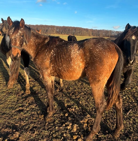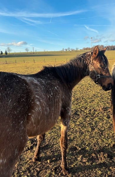 Sana (geb. 14.06.2024) ist eine typvolle junge Stute mit schöner Zeichnung und sehr klarem, ruhigem Wesen. - Bay Varnish Roan Appaloosa - halfterführig - verladefromm - klar im Kopf - brav im täglichen Umgang - aktuell roh (altersgerecht) - ideal für: Freizeit, weitere Ausbildung, oder interessant für Farbzucht Der Verkauf erfolgt aus Altersgründen im Rahmen einer Bestandsverkleinerung eines über viele Jahre aufgebauten Pferdebestandes. Es handelt sich ausdrücklich nicht um Notverkäufe.