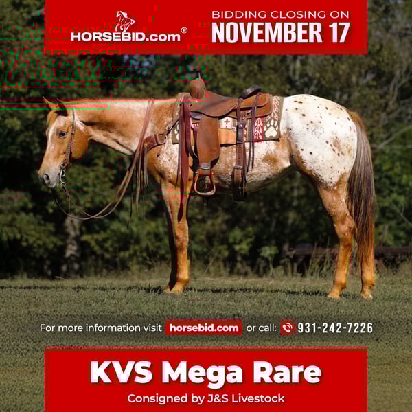 🎲𝓽𝓱𝓮 𝐑𝐈𝐃𝐄𝐑'𝐒 𝓒𝓱𝓸𝓲𝓬𝓮🎲 Happening now thru MONDAY | NOVEMBER 17th - Available EXCLUSIVELY on HorseBid's website! For more details and to register visit: www.Horsebid.com CONSIGNOR CONTACT: J&S Livestock 931-242-7226 LOCATION: Santa Fe TN BREED: Appaloosa REGISTERED: Yes REGISTERED NAME: KVS Mega Rare COLOR: App HEIGHT: 15.1 AGE: 8 GENDER: Mare “KVS Mega Rare” AKA Moonpie is a 2017 model registered app mare standing 15.1 hands, and is as beautiful as one could ask for and built correctly- great bone structure and disposition. This is the true definition of a gentle, versatile mare almost anyone can get along with and enjoy. Moonpie has been clocking in the 2d, and progresses each run. This mare will give you her all each and every time and wants to always be better. She has so much potential to be clocking in the 1d with consistent runs. She also knows poles as well. Moonpie would be an excellent candidate for anyone looking for a kid a good step-up horse to go out and rodeo on. She’s easy to handle- she does good stalled or turned out on pasture, she’s easy to bathe and stands quietly at all cost. She stands to be mounted good and trailers perfectly. Moonpie also makes a pretty good trail horse to just go out on and relax-we have had her on multiple trail rides and she’s always done fantastic. She won’t spook and will stay level headed out on the trails for her rider. This mare has a really soft handle to her and moves off leg pressure nicely. This is such a great mare that has nothing but want to & try, she aims to please you. She has no health issues or bad habits, and has a clean, recent PPE. For any further information on Moonpie please down hesitate to call or text! Bailey 931-242-7226 or JT 931-698-7159