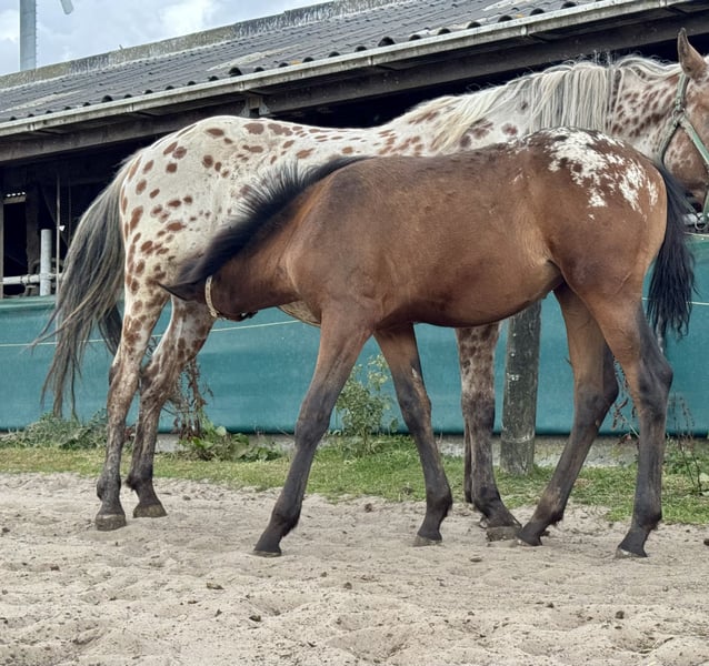 ✨ Valentijn ✨ Super tolles Appaloosa-Stutfohlen! Extrem bewegungsfreudig und super brav. Einzigartige Gelegenheit, das erste Fohlen von Rocking Billy. Rocking Billy (Le Formidable) ist der Championhengst von 2025. Valentijn ist sehr sozial und kennt das Fohlen-ABC. Die Mutter ist eine Appaloosa-Stute von 1,48 m. Sie wird wunderschön Appaloosa durchgefärbt, sie hat bereits Punkte bis zur Schulter.