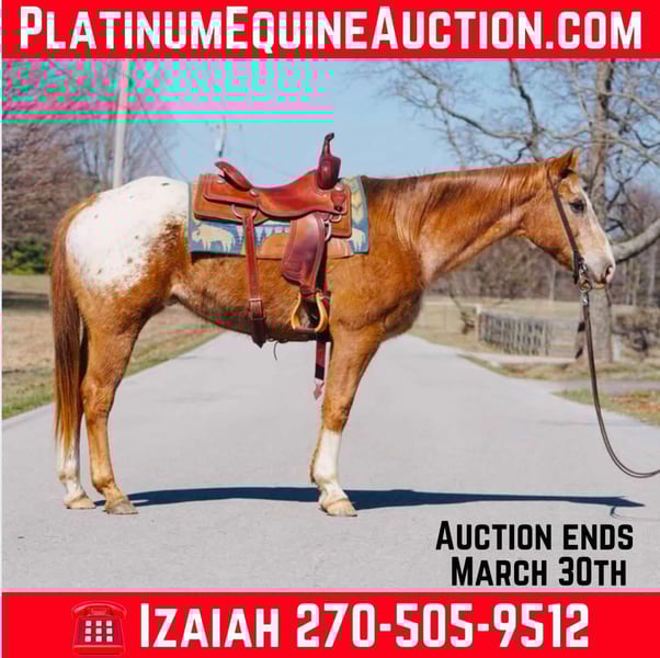 ONLINE AUCTION Place your bids at www.PlatinumEquineAuction.com Starting Bid $3500 Auction ends March 30th, 2025 Need a new saddle? Check out White Rock Saddles on our website or Facebook! Gus is a 12 YEAR OLD APPALOOSA GELDING! Gus is a once in a lifetime gelding, This gelding is husband SAFE and kid SAFE! Gus has been used for every aspect of riding you can imagine! He has been trail rode many of miles and absolutely loves his job! He will cross the creeks and logs with ease and has been to over night camping trips! He has been rode in the Sunday funday shows by the youth! He has been used the last 3 years for giving lessons and he LOVES kids! He has been rode English and Western and does perfect at both of them! We have also used Gus to check cattle and just check the fence on the farm! He will go any direction you point him! He Loads,Clips,Bathes and he will be the first one up to you in the pasture! This gelding is ready for his new home and would make someone a GREAT companion! Located In Rineyville Kentucky! Call Izaiah Ryan 270-505-9512! ONLINE AUCTION Place your bids at www.PlatinumEquineAuction.com Starting Bid $3500 Auction ends March 30th, 2025 Need a new saddle? Check out White Rock Saddles on our website or Facebook!