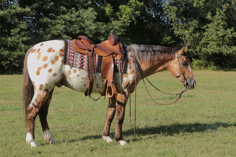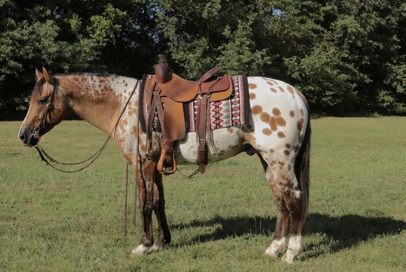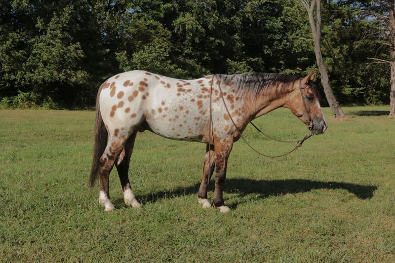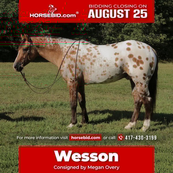 ⭐️ 𝐀𝐔𝐆𝐔𝐒𝐓 𝓐𝓵𝓵 𝓢𝓽𝓪𝓻 𝓛𝓲𝓷𝓮𝓾𝓹 ⭐️ Happening now thru MONDAY | AUGUST 25th - Available EXCLUSIVELY on HorseBid's website! For more details and to register visit: www.Horsebid.com CONSIGNOR CONTACT: Megan Overy 417-430-3199 LOCATION: Fair Grove MO BREED: Appaloosa REGISTERED: Yes REGISTERED NAME: Smokin Six Gun COLOR: Spotted Dun HEIGHT: 14.2 AGE: 4 GENDER: Gelding It only takes a couple of words to describe this horse… ⭐ One of a Kind ⭐ You don’t find one like this every day. Wesson is the kind of horse that makes riding enjoyable and completely stress-free — a true unicorn. Aside from his gorgeous spotted coat and personable demeanor, he’s just as exceptional to ride. Sired by Smoking Sixcess (NRHA Level 4 Futurity Finalist, LTE $13,000+), a son of Colonels Smoking Gun — the #1 all-time reining sire and NRHA Hall of Fame inductee with over $16 MILLION in offspring earnings — his pedigree speaks for itself. Finished in all reining maneuvers, Wesson is a big +1 stopper and turner, with effortless lead changes and elegant, cadenced circles. Successfully shown in reining, ranch riding, and ranch trail with multiple first-place finishes, he’s the same horse every time he walks into the pen. Naturally low-headed and soft in the face, show prep is easy. But Wesson isn’t just a show horse — he’s the ultimate everyday partner. He’s crossed rivers, creeks, mud, thick brush, wide-open pastures, steep rocky hills… nothing phases him. He rides out alone or in big groups without a fuss. He carried the American flag in front of 2,000+ people at the Baker Spain 2025 grand entry, walking quietly on a loose rein despite concert-level speakers. He’s even ridden in the middle of a Whiskey Myers concert, right under the Jumbotrons — how many horses can do that? Wesson rides calmly through busy town traffic and even through drive-thrus like it’s nothing. Take him to the river for swimming, tubing, or just relaxing — he’s always a trustworthy partner. He’s been used at the stockyards opening gates and sorting cattle, with a natural cow sense and flag work like a pro. He’s even been the steady snubbing horse for broncy colts. No saddle? No bridle? No problem. Wesson will even lay down on cue so you can mount easily anywhere, anytime. Hop on bareback and bridleless in the pasture and feel safe doing it. Absolutely anyone can ride and handle this gelding— kids, adults, or even grandma. He’s gentle to catch, saddle, bridle, and ride with zero issues. There’s simply nothing this horse won’t do, and definitely not another one like him. You can clip him without a halter — ears included! He stands tied all day, is perfect for the farrier, loves baths, and thrives on attention. Sound in every way, with zero buck, kick, rear, or bite — even after time off. NRHA and MoRHA memberships are current.