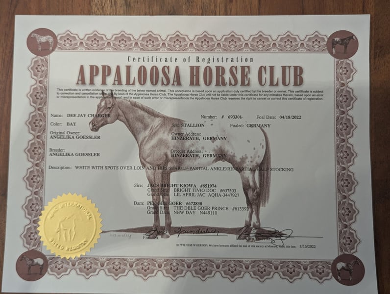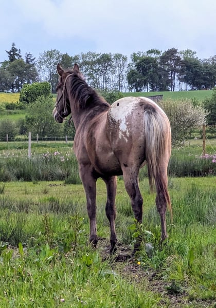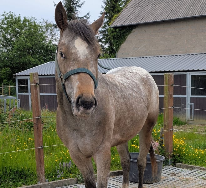 Dee Jay is een grote, sterke Appaloosa ruin, 157/158 cm hoog. Hij heeft stevige botten en harde hoeven. Hij is nu klaar om onder het zadel te worden gebracht; wij zijn voorstander van rijden met 4- of 5-jarige paarden. Dee Jay is een echte knuffelbeer, geen hectische pony, maar een die eerst nadenkt voordat hij handelt. Heel lief en mensgericht, met veel verstand. Hij komt uit beproefde ranchhorse-lijnen, maar we kunnen ons hem ook goed voorstellen in reining, omdat hij ondanks zijn grootte zeer snel en wendbaar is. Voor de ranchhorse-klassen, waarin hij ook mentaal moet werken, is hij perfect geschikt. Video's kunnen via WhatsApp worden gestuurd.