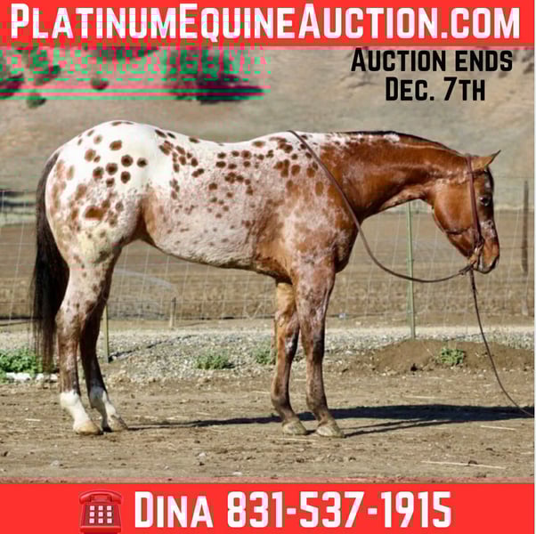 ONLINE AUCTION Place your bids at www.PlatinumEquineAuction.com Starting Bid $3500 Auction ends December 7th, 2025 Need a new saddle? Check out White Rock Saddles on our website or Facebook Crime Striker IM –Registered 2020 Appaloosa Gelding, 15.2 Hands • Blanket & Spots • Foundation Appaloosa Breeding. If you’ve been searching for your next lifelong companion — the kind you can trust, enjoy, and rely on for years — Crime Striker IM deserves a serious look. He isn’t just a pretty gelding with color. He’s the result of generations of purposeful Appaloosa breeding, and he carries himself with the steady, thoughtful way that comes from a good mind paired with a good upbringing. Crime Striker IM already has real miles under his belt and a solid foundation that shows the moment you sit on him. He goes low-headed, stays soft in the bridle, and lopes a clean, correct circle. His stop is smooth, his cadence is natural, and he rides with the kind of level, settled mindset that makes every ride feel the same — honest, dependable, and uncomplicated. He’s seen all the right things: flags, tarps, bridges, water, rocks, brush, and open country. He meets each obstacle with a thinking attitude, never in a rush, never bothered. Out on the trail he’s steady and sure, willing to ride out alone or with company, and comfortable in new places. He’s gathered cattle, stepped through ranch chores, and carries himself like a horse raised to handle real work without fuss. At 15.2 hands, he has the size and movement to shine in either Western or English tack. He’s been ridden English and carries a long, sweeping stride that gives him a polished look in any arena. Whether you want a versatile ranch gelding, a handsome all-arounder, or an elegant English prospect, he’s got the build, the style, and the brain to fit the job. His pedigree backs all of this up. Crime Striker IM is sired by Star Striker IM, a horse tracing back to Awestruck, a line known for good bone, dependable minds, and lasting soundness. His dam, Dunes Desire, brings in Imaginate and The Crime Seen, foundation Appaloosa names known for producing correct, durable, sensible horses with the kind of disposition people look for. This is a gelding bred to last. Around the barn, he’s just as easy. Friendly, kind, and straightforward to handle. He meets you at the gate, stands quiet to clip, tie, shoe, and saddle, and settles easily in a stall or pasture. He hauls well, steps off relaxed, and carries himself with a maturity that’s impressive for his age. Crime Striker IM is a young gelding with miles, manners, color, and the kind of foundation you can build a lifetime on. If you’re looking for a partner you can enjoy now and appreciate for many years to come, he’s standing here ready. Located at Longhorn Ranch – Paicines, California Contact: Dina 831-537-1915 Shipping available nationwide ONLINE AUCTION Place your bids at www.PlatinumEquineAuction.com Starting Bid $3500 Auction ends December 7th, 2025 Need a new saddle? Check out White Rock Saddles on our website or Facebook