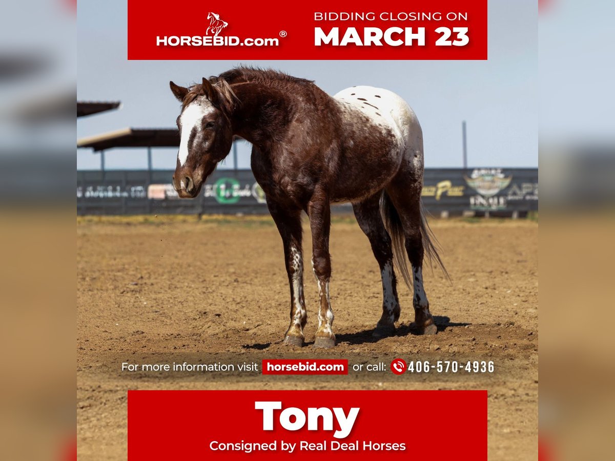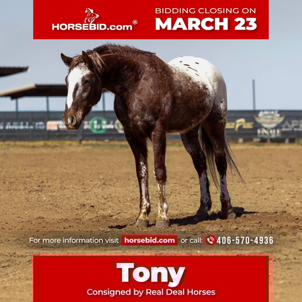 ⚜️𝓽𝓱𝓮 𝐆𝐎𝐋𝐃 𝓢𝓮𝓵𝓮𝓬𝓽⚜️ Happening now thru MONDAY | MARCH 23rd - Available EXCLUSIVELY on HorseBid's website! For more details and to register visit: www.Horsebid.com CONSIGNOR CONTACT: Real Deal Horses 406-570-4936 LOCATION: Ripley, OK BREED: Appaloosa REGISTERED: No COLOR: Chestnut HEIGHT: 14.1 AGE: 6 GENDER: Gelding Tony is the kind of horse that gets along with everyone and is happy to do whatever job you ask of him. He’s been ridden extensively on the trails, through town and traffic, and around dogs, goats, and pigs without batting an eye. Tony is confident outside and travels along relaxed and sure footed wherever you point him. On the ranch, Tony is a true using horse. He has experience sorting, gathering, roping, and doctoring cattle, and he handles the work with a calm, sensible attitude. He’ll side pass easily to open and shut gates, has a nice one hand neck rein, and lopes off with the cutest rocking chair lope that’s comfortable all day long. Tony has excellent ground manners and is a pleasure to have around the barn. He’s the type that will step up and go to work when asked, but will also slow down and take care of someone who is still learning. He’s confident around tarps, ropes, balls, and all the “circus” activities, making him a great candidate for a wide variety of riders and jobs. Whether you’re looking for a dependable ranch horse, trail partner, 4-H mount, rope prospect, or gymkhana horse, Tony is the kind that checks all the boxes. Good minded, versatile, and fun to ride, whether you’re headed out to work cattle or just saddling up for a relaxing ride. Call Trevor at 406-570-4936 to schedule a time to come ride him or arrange a PPE. Nationwide transportation can be arranged.