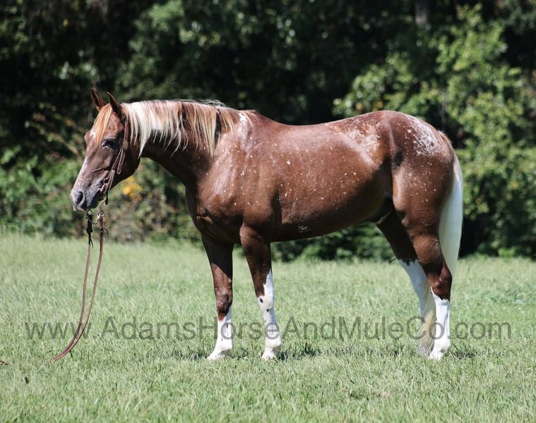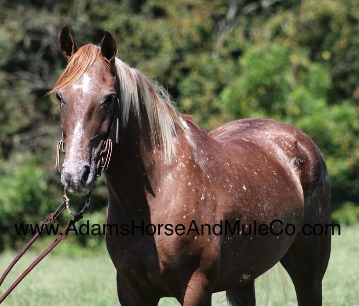 Go to www.AdamsHorseAndMuleCo.com for more pics and a video. AHAMC has been in the horse business and sold horses over the internet since 2005. We have a long track record of success with hundreds of happy customers. We work hard to match riders with the correct horses and specialize in beginner safe, family friendly horses that have been used and checked out by our family! I’ll bet you have not seen many like Astro before? Astro is an appaloosa paint gelding with snowflake spots all over with 4 big stockings and a white tail. He is standing around 15h and is 7 years old. He is friendly with lots of personality! Astro is a horse that the whole family can ride and enjoy! He has been ridden down the highways and he is traffic safe as well. Astro is great on trails and he will cross creeks, ditches, logs and navigate rough rocky areas. He has a smooth jog, a nice easy to set lope, a good stop, turns several circles both ways and backs with ease! He has been exposed to all kinds of wildlife such as deer or turkey or other animals like cows or dogs and will go anywhere that he is asked too. He has been rode many miles in the mountains of Eastern Kentucky and encountered every obstacle possible on the trail. He will go up or down even the steepest slopes, across deep creeks, over downed trees, and over all types of rough terrain while still being sure footed. Astro is not cinchy, cold backed, does not crib or weave. Astro is a once in a lifetime type of horse!!! Feel free to call Eric 606-308-2461 with any questions.