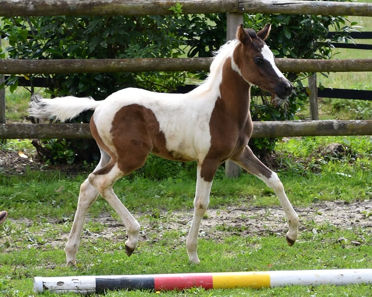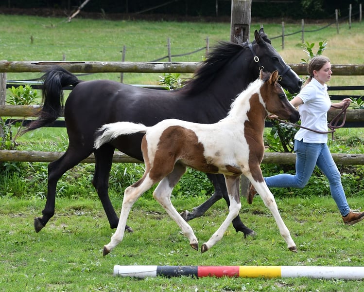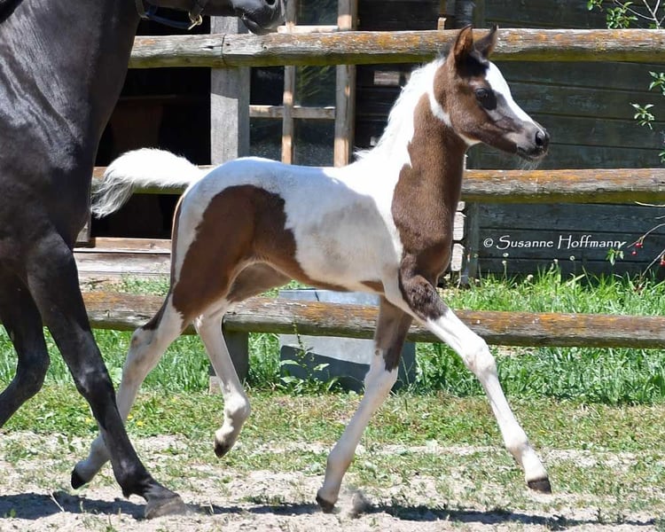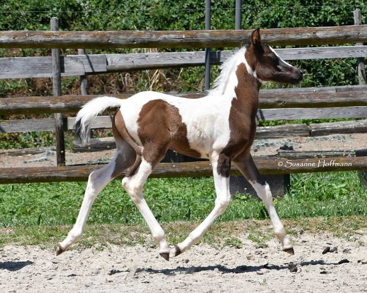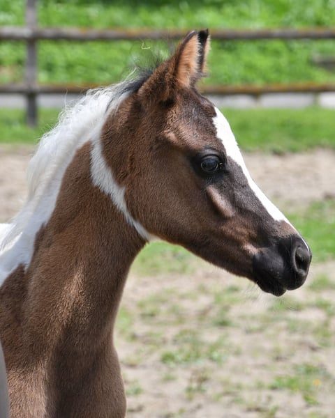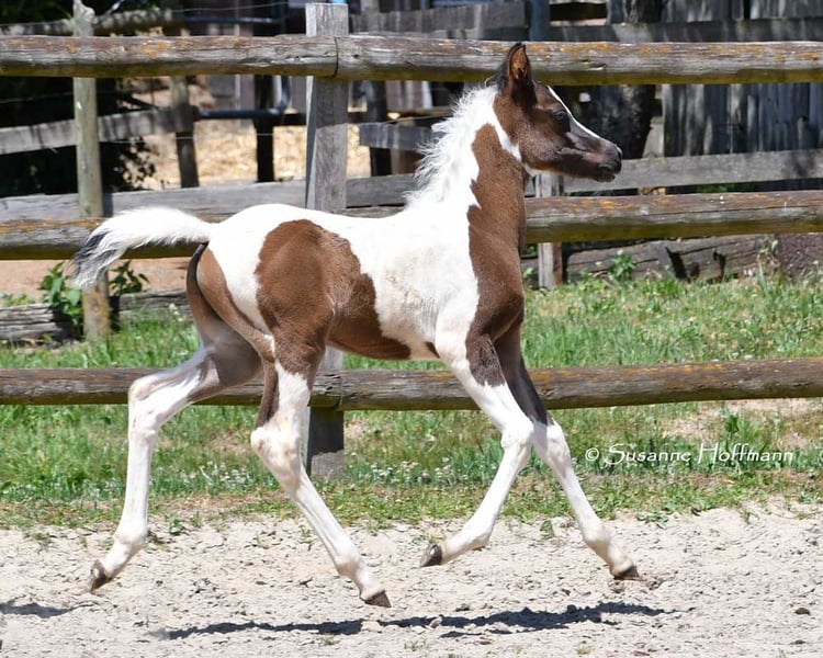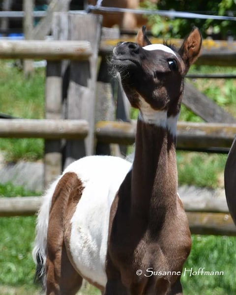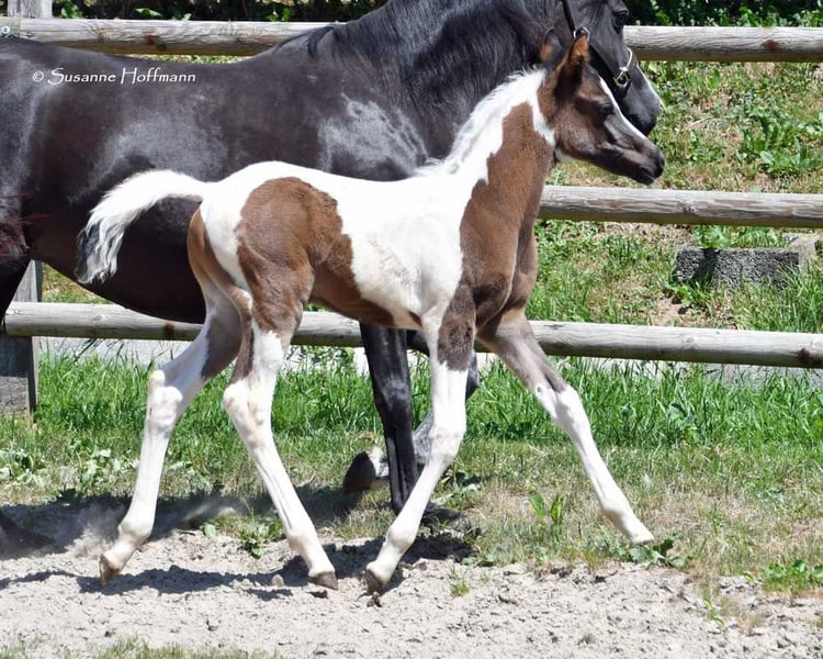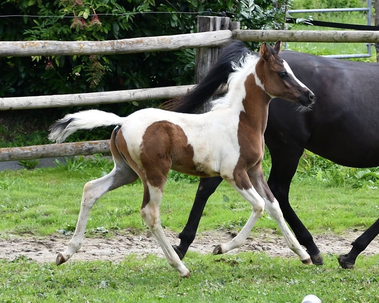 Our Lopez knows exactly that he is beautiful and shows it, but he is also very people-oriented and calm. He is a beautifully marked black tovero, which means he carries both the tobiano gene and a frame overo gene, and can pass on these two genes together or separately. Unfortunately, he is related to almost all of our mares, which is also the reason why we cannot keep him ourselves. He was awarded a super high score of 8.75 and particularly impressed in type and movement. Currently, he appears somewhat brownish, but it can already be seen that he is a true black pinto. Both his father and his mother's father were imported from the USA, which means he is likely to be genetically unrelated to most other breeders. His father, Secret Legacy, was awarded as a performance stallion due to his excellent stallion performance test, and so far, his offspring have shown to be particularly easy-going, very balanced, and rideable.