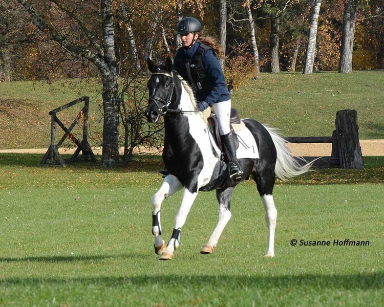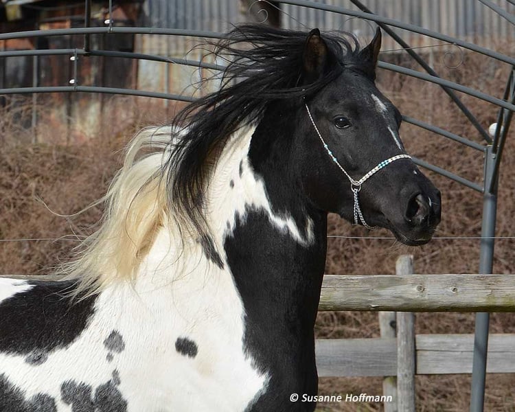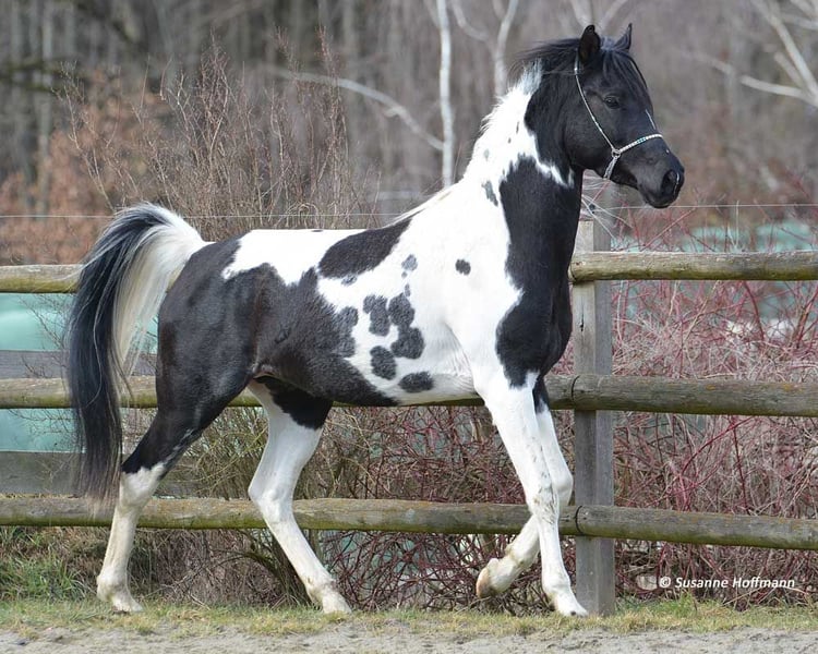 Nuestro Lopez sabe exactamente lo hermoso que es y lo demuestra, pero también es muy sociable y tranquilo. Es un hermoso caballo de color tobiano, lo que significa que lleva además del gen Tobiano un Frame Overo, pudiendo transmitir estos dos genes de forma conjunta o individual. Lamentablemente, en nuestro establo está relacionado con casi todas las yeguas, y esa es la razón por la cual no podemos quedárnoslo nosotros mismos. Fue premiado con una puntuación de 8,75, lo que indica un rendimiento excelente, destacando especialmente en tipo y movimiento. Actualmente, todavía parece un poco más oscuro, pero ya se puede ver claramente que es un verdadero caballo tobiano negro. Tanto su padre como el padre de la madre fueron importados de EE. UU., por lo que probablemente sea de sangre pura en la mayoría de los otros criadores. Su padre, Secret Legacy, fue distinguido como semental de alto rendimiento debido a su excelente prueba de rendimiento y, hasta ahora, su descendencia se muestra muy dócil, equilibrada y apta para la monta.