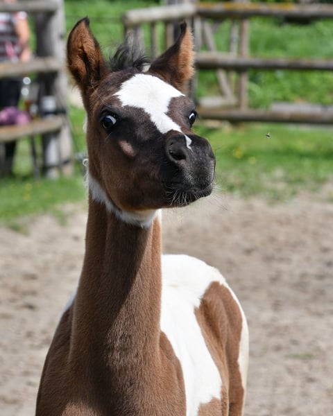 Notre Lopez sait exactement qu'il est beau et le montre, mais il est aussi très attaché aux humains et calme. C'est un magnifique Rapp Tovero, ce qui signifie qu'il porte non seulement le gène Tobiano mais aussi un gène Frame Overo, et peut transmettre ces deux gènes ensemble ou séparément. Malheureusement, il est apparenté à presque toutes nos juments, ce qui est la raison pour laquelle nous ne pouvons pas le garder. Il a été très bien noté avec 8,75 et a particulièrement impressionné par son type et son mouvement. Actuellement, il semble encore un peu brunâtre, mais on peut déjà bien voir qu'il est un véritable Rappschecke. Son père ainsi que le père de sa mère ont été importés des États-Unis et il devrait donc être génétiquement éloigné de la plupart des autres éleveurs. Son père, Secret Legacy, a été distingué comme étalon de performance en raison de ses bons résultats à l'épreuve de performance des étalons, et jusqu'à présent, sa descendance se montre particulièrement sociable, très équilibrée et montée.