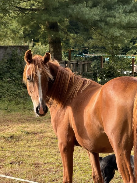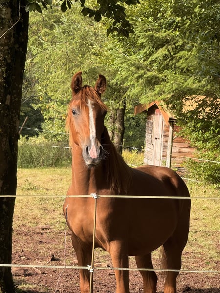 Available for reservation 🍀 The Trèfle d'Or breeding farm offers a lovely and very gentle colt (entire) born in May 2024. 🔥 Aragon Psyche TDO 🔥 75% Arabian by Nicolaï de Pawi (Padrons Psyche lineage, Padrons Immage, MYSTIC IMMAGE x NEDJNEMA, NEMAN) Let’s talk about his skills: ✅ loads into the trailer ✅ walks on a lead and in hand ✅ grooming ✅ knows how to tie ✅ he is moved from pasture to pasture on foot with other horses, so he is familiar with road traffic (trucks, motorcycles, cars, bicycles) ✅ daily handling and visits ✅ respectful of fences A bit more in-depth training will be done during the winter period. Living conditions: He has lived in a herd and outdoors with shelter since birth. He is surrounded by friends with whom he learns the ways of a horse. 🐴 Well-balanced, very cuddly and affectionate 🤗 He is a young colt who learns quickly. He has been raised with a lot of care. Physical description: 🟡 Beautiful gaits, airy and light in his movements. 🟡 Estimated adult height of 160 cm 🟡 He is bony and will be a carrier (mother is quarter/Arabian) 🟡 Entire (castration possible for an additional fee). Opportunity for breeding or just a leisure or competition horse for endurance/cross/trec 🟡 He has a very nice head type with a beautiful blaze 🟡 Burnt chestnut 🟡 Unlimited grass and hay, currently still nursing from his mother. 🟡 No health issues ‼️ He is still growing and will be promising as an adult. —> Raised with care, he is up to date on everything: vaccinations, hoof trimming, deworming, dentist seen once. IFCE papers registered ACA DSA 75% Tested SCID negative and CA carrier 💰 Payment plan available, easy payment options 🧾 Invoice and recoverable VAT for professionals Sales contract Veterinary visit at the buyer's expense Transport possible Come meet him 🥰