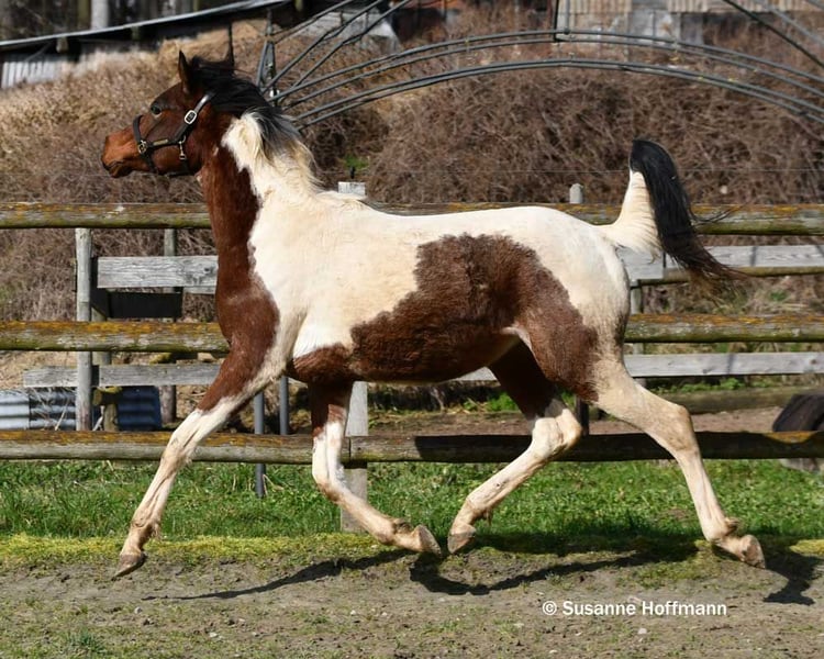 Lysanto is a very handsome young Pintabian stallion who was awarded a prize as a foal. He knows the foal ABC, i.e. the daily handling, leading, tying up and of course the blacksmith. He is already nice and big, although his mother is also a really big mare. He has great movements, stands correctly on his feet and has beautiful big eyes. His sire Secret Legacy is imported from the USA, licensed in Germany and has passed his stallion performance test as a performance stallion, and he could particularly inspire with his very good character and basic gaits. He can be seen in the last photos. Lysanto's dam is a premium mare and elite mare and has only had award-winning offspring to date. She has outstanding movements and a first-class character. Lysanto has very rideable and performance-oriented horses on both sides of his pedigree and is therefore just as interesting for riders with sporting ambitions as for breeders.