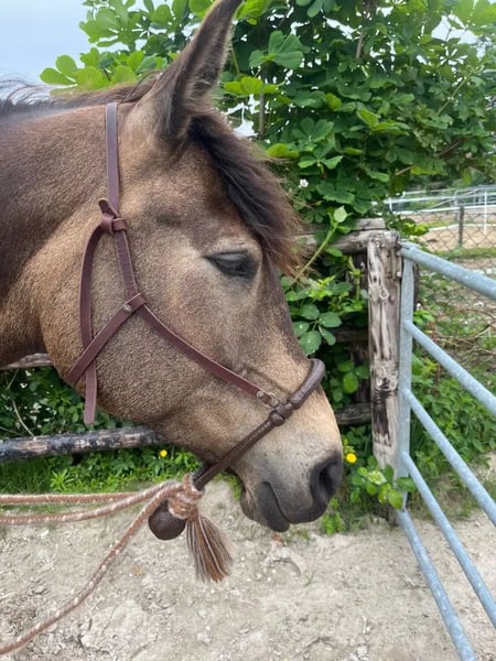 Wenn Alles passt, biete ich meine liebe 10 jährige Partbred Araber Stute Loui (Lou Hazel) in der Farbe Buckskin zum Verkauf an. Sie ist ein sehr feines und robustes Pferd und hat keine Ekzeme oder sonstige Krankheiten. Eine große AKU mit Röntgenbildern (auch von Rücken und Hals) liegt vor. Ich habe sie mit Hilfe meiner Trainerin selbst eingeritten und bin sie bisher ausschliesslich gebisslos geritten. Sie reagiert sehr gut auf feine Hilfen. Wir haben viel Bodenarbeit und Natural Horsemanship gemacht. Ansonsten sind wir in erster Linie freizeitmäßig im Gelände unterwegs. Ich habe sie auch hin und wieder für die therapeutische Arbeit eingesetzt. Sie stand ganzjährig im Offenstall in einer gemischten Herde. Zuletzt in einer reinen Stutenherde, aber sie kennt Beides. Ich würde mir einen Platz wünschen, wo sie das ganze Jahr über tagsüber in einer Herde steht und viel Platz zum Laufen hat und nachts entweder in einem ausreichend großen Offenstall (damit sie sicher einen trockenen Platz hat) oder in ihrer eigenen Box. Sie hat gesunde Hufe, läuft barhuf (vorne zieh ich ihr für Ausritte manchmal Hufschuhe an) und lässt sich ohne Probleme die Hufe bearbeiten. Sie wurde regelmäßig geimpft, entwurmt und auch die Zähne wurden jährlich gemacht. Ausserdem bekommt sie in unregelmässigen Abständen eine ostheopatische Behandlung. Sie ist sehr brav und zu jedem Zeitpunkt am langen Strick supergut zu halten. Und auch beim Reiten ist sie artig. Sie läuft gerne und ist sehr schnell. Bei mir stand sie zuletzt in einer Stutenherde. Sie kennt aber auch gemischte Herden. Sie ist eher rangniedrig. Jetzt gerade steht sie tagsüber auf dem Paddock und nachts in der Box. Ich gebe sie nur in allerbeste Hände ab und sehe sie auch nicht im Sport. Sie könnte vielleicht auch für die Zucht interessant sein, weil sie viele verschiedene Farbgene vererbt. Auf dem letzten Bild ist ihr Vater zu sehen: Paintabian "Shicco Ibn Shai": https://beta.allbreedpedigree.com/shicco-ibn-shai-R1hpErzw/pedigree Ich habe für sie ein optimal sitzendes Bosal (von der Hofreitschule Bückeburg), mit Alpaca Mecate und ein Fellpad von Christ Cloud spezial mit Filzschabracke. Ausserdem noch ein großartiges Labona Reitpad. Das kann Alles gerne separat dazu erworben werden. Ebenso die Hufschuhe (Scoot Boots) Videos auf Anfrage.