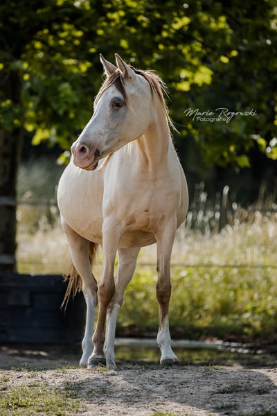 Arabian Partbred Mare (approx. 93.75% Arabian blood) Amber Champagne | born 03/2013 | 148 cm KHREME KHARAMEL GF is a typical, compact mare with a high percentage of Arabian blood and an unusual colouring in a rare amber champagne tone. She combines elegance, expression and a special genetic component that can be specifically used in breeding. Her sire, Khaffee Kharamel GF, is a licensed and performance-tested Partbred Arabian stallion with successful offspring in various breeding programmes. Her dam, Painted Lilo WS, adds substance and charisma. Khreme is currently not ridden. She lives in an open stable, is well integrated into the herd and is accustomed to daily contact with humans.
