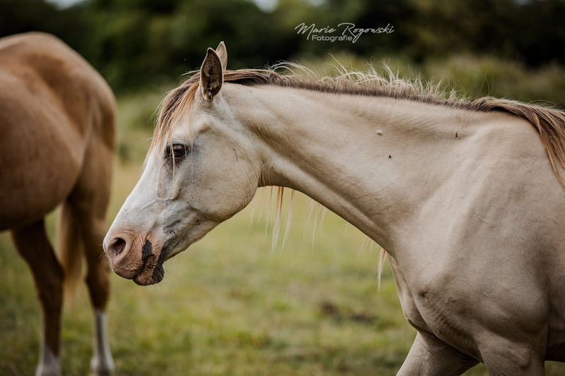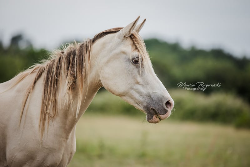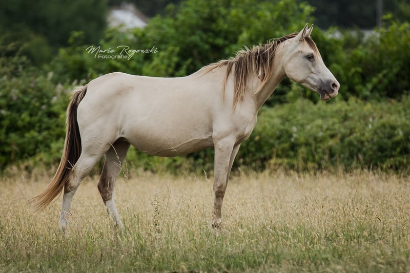 Jument arabophone (environ 93,75 % de sang arabe) Amber Champagne | née en 03/2013 | 148 cm KHREME KHARAMEL GF est une jument compacte, typée, avec une forte proportion de sang arabe et une robe exceptionnelle dans une rare teinte ambre champagne. Elle allie élégance, expressivité et une composante génétique particulière qui peut être utilisée de manière ciblée dans l'élevage. Son père, Khaffee Kharamel GF, est un étalon arabe partbred approuvé et testé sur ses performances, dont la descendance a connu le succès dans différents programmes d'élevage. Sa mère, Painted Lilo WS, lui apporte une substance et un charisme supplémentaires. Khreme n'est actuellement pas montée. Elle vit dans une écurie ouverte, est bien intégrée au troupeau et est habituée au contact quotidien avec les humains.