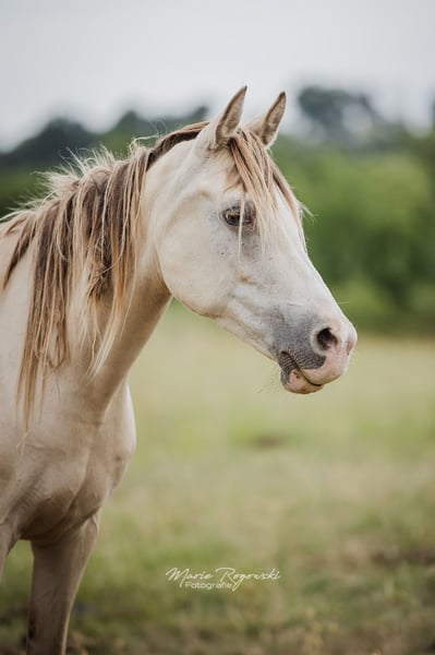 Yegua árabe de línea parcial (aproximadamente 93,75 % sangre árabe) Amber Champagne | nacida en 03/2013 | 1,48 m KHREME KHARAMEL GF es una yegua de tipo compacto y bien proporcionada, con un alto porcentaje de sangre árabe y un color excepcional en el raro tono Amber Champagne. Combina elegancia, expresividad y una componente genética especial que puede ser utilizada de manera estratégica en programas de cría. Su padre, Khaffee Kharamel GF, es un semental árabe de línea parcial aprobado y con rendimiento comprobado, con descendencia exitosa en diversos programas de cría. La madre, Painted Lilo WS, aporta mayor sustancia y presencia. Khreme no ha sido montada todavía. Vive en paddock libre, está bien integrada en la manada y está familiarizada con el trato diario con las personas.