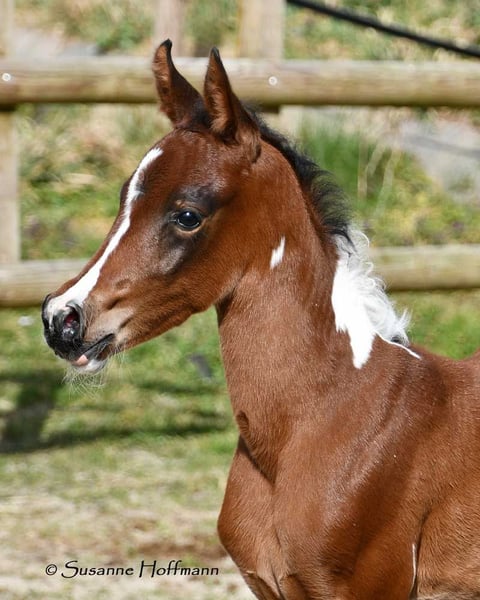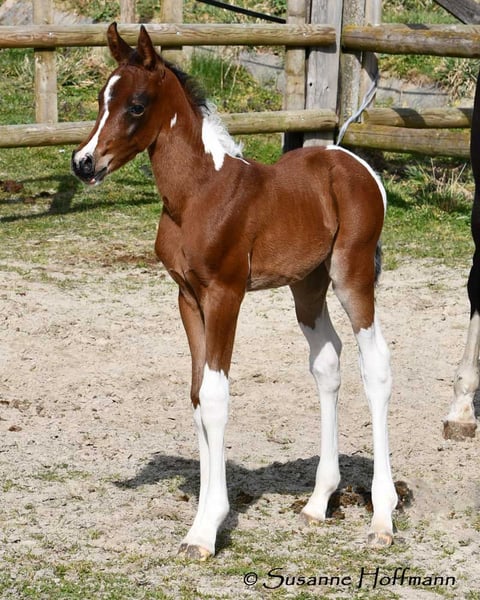 Nasza Vendetta to źrebię klaczy o wyraźnych cechach arabskich, z piękną głową, ale także dobrą budową i najlepszymi cechami konia wierzchowego. Już teraz prowadzi się ją na kantarze i codziennie ma kontakt z ludźmi, a do odsadzenia nauczy się również całego ABC źrebięcia, w tym kowala i załadunku. Vendetta została homozygotycznie przetestowana na Tobiano i na czarny kolor, co czyni ją jeszcze bardziej interesującą dla hodowli, ponieważ zawsze będzie miała kolorowe źrebięta i nigdy w maści kasztanowatej. Na zdjęciach ma zaledwie 2 dni. Jej matka Classic Valencia to klacz Arabisch Partbred z ponad 99% krwi arabskiej, o doskonałym charakterze i wspaniałych ruchach. Ojcem małej jest nasz Painted Dragon, ogier elity z doskonałym potomstwem, który nie tylko sam jest absolutnym skarbem i bardzo łatwy do jazdy, ale także niezawodnie przekazuje te cechy swoim źrebiętom. Jest widoczny na dwóch ostatnich zdjęciach.