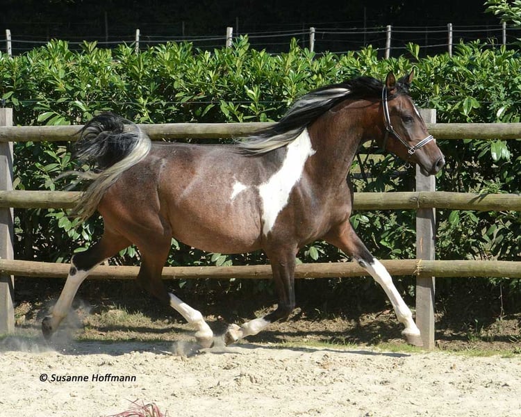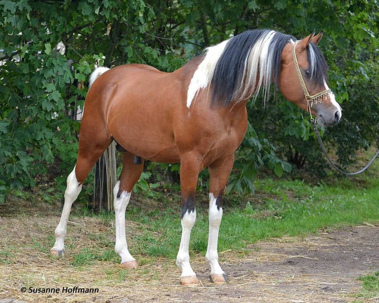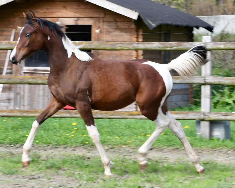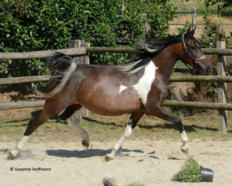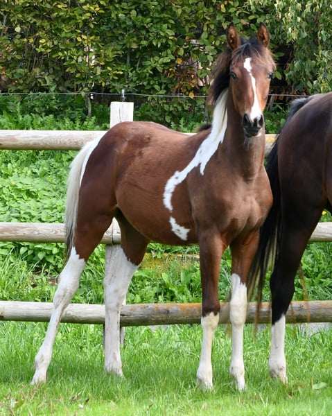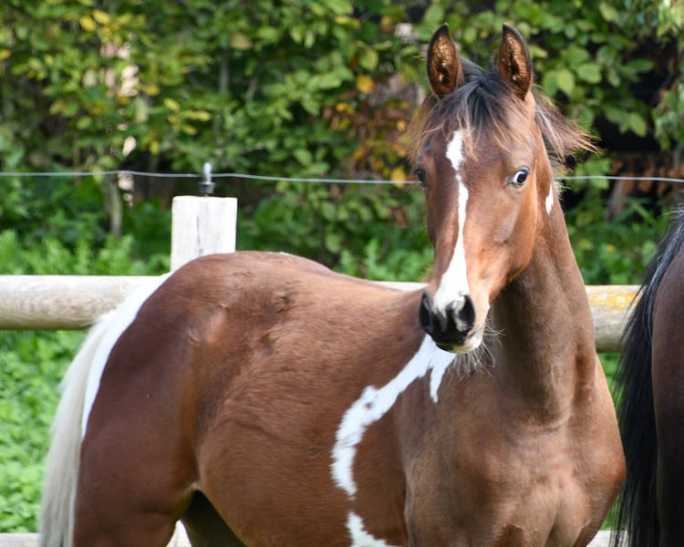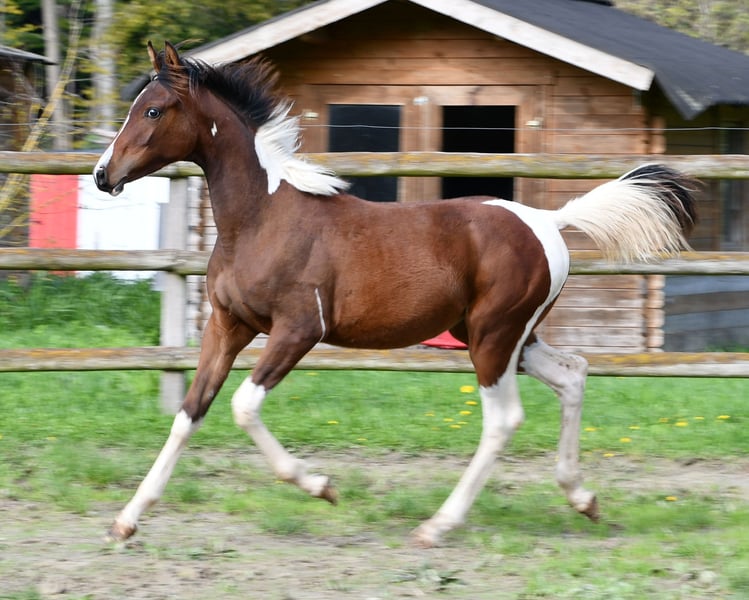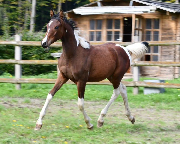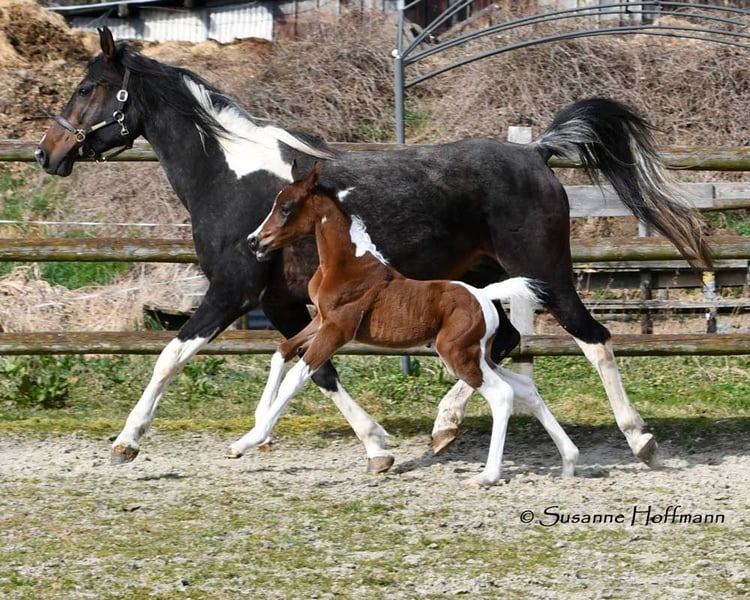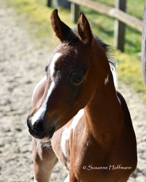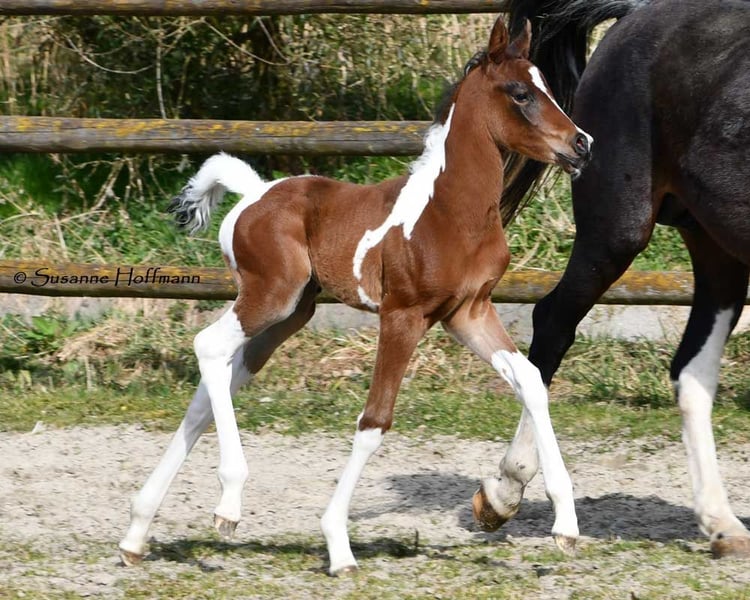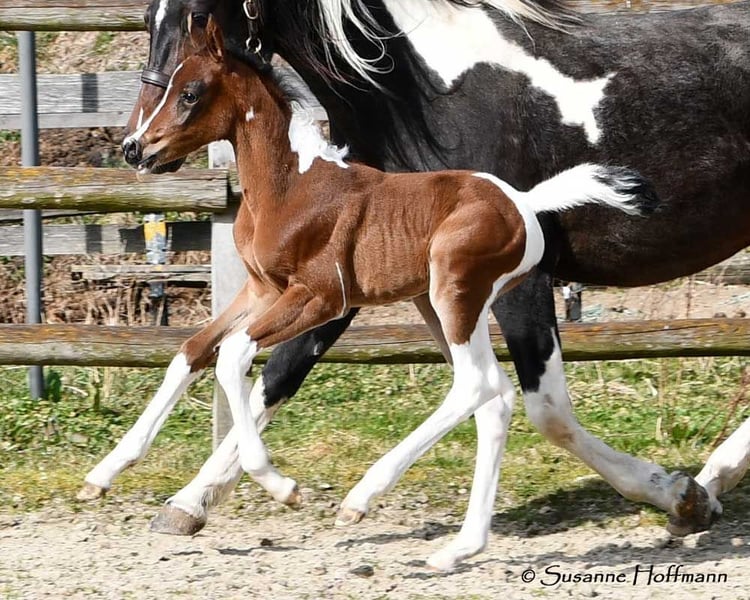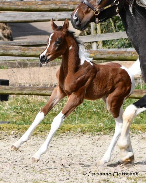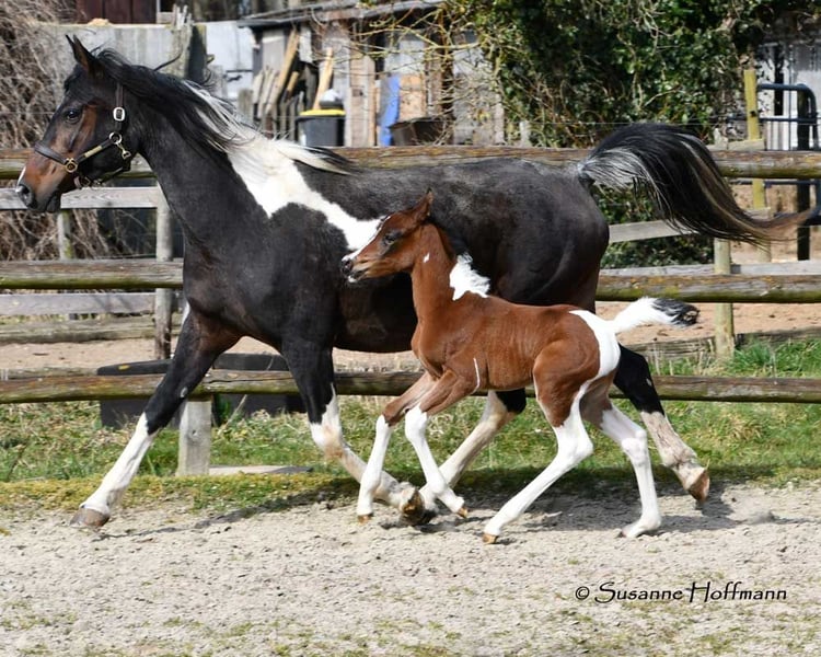 Our Vendetta is a filly with a strong Arabian influence, featuring a beautiful face, good conformation, and excellent riding horse qualities. She is already halter-broken and interacts with people daily, learning the foal ABCs, including farrier handling and loading, until weaning. Vendetta is homozygous for Tobiano and Black, making her especially interesting for breeding, as she will always produce colorful foals and never chestnut ones. In the photos, she is only 2 days old. Her dam, Classic Valencia, is an Arabian Partbred mare with over 99% Arabian blood, an excellent character, and wonderful movement. The sire of the little one is our Painted Dragon, an elite stallion with outstanding offspring. He is not only a treasure himself and very rideable but also reliably passes these traits on to his foals. He can be seen in the last two pictures.