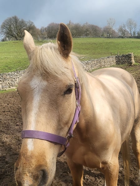 Beautiful palomino mare from the Roundhills stud. Good to catch, box and farrier. Loves to jump - jumps on her own over hedges and walls !!! Backed but needs bringing on - left to mature. 16hh 60% arab (registered with arab society) x warmblood Has potential as an eventer - has speed and power. Also would do VERY well in shows - she has fantastic movement and looks like shes floating.