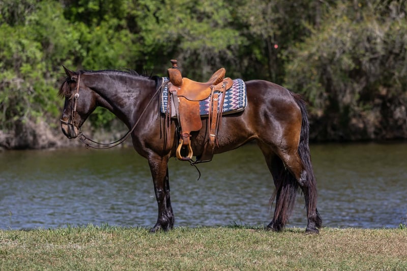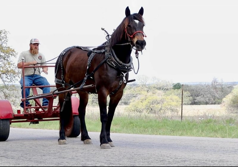 "AVAILABLE ON ONLINE HORSE AUCTION AT www DOT PlatinumEquineAuction DOT com BIDDING OPEN NOW thru SUNDAY | APRIL 19TH! *Final price will be determined on auction site* CONSIGNOR CONTACT INFO: Cheyenne Hirsch 281-202-5377 LOCATION: Victoria, TX Beans is a 6-year-old Gypsy Vanner/Percheron cross mare with a big build, lots of bone, and a presence that gets noticed wherever she goes. She is a sturdy, substantial mare that would make a great trail horse, ranch horse, broodmare, driving horse, or a beautiful English prospect. Beans was raised and broke by the Amish and has experience plowing. Because of this, she has a solid foundation and could easily transition back into a driving program or farm work lifestyle. She has good ground manners and is easy to catch, leads, loads, ties, stands for the farrier, and stands quietly to be bathed, groomed, and tacked. Under saddle she walks, trots, lopes, and backs. She has been ridden on trails, through water, and in town, and she handles new places and environments well. Beans prefers a slower, easy-going pace and is more of a laid-back riding horse. She would rather cruise along than go fast, but she will move out and pick up speed when asked. She does best when ridden relaxed and is happiest just covering ground and going down the trail. She prefers to be ridden in a light hackamore and rides well in it. She has also had a foal previously and was a good mother, so she would also make a nice broodmare prospect. With her build, size, and movement, she would make a very pretty English prospect with more time and riding. Beans is a big, eye-catching mare with a lot of versatility and would be a great fit for someone looking for a solid, easy-to-handle horse to enjoy on trails, around the ranch, in harness, or in the English arena. For more information, contact Cheyenne at 281-202-5377.