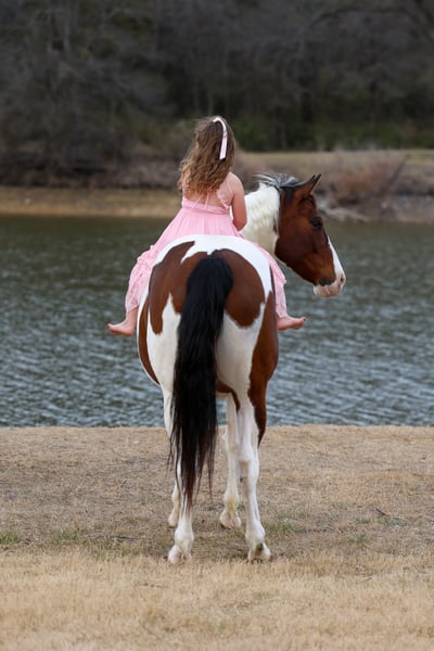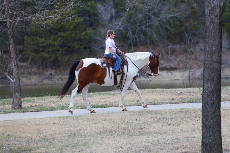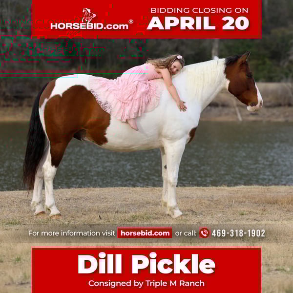 ⚜️𝐭𝐡𝐞 𝓔𝓵𝓲𝓽𝓮 𝐒𝐩𝐫𝐢𝐧𝐠 𝐂𝐥𝐚𝐬𝐬𝐢𝐜⚜️ Happening now thru MONDAY | APRIL 20th - Available EXCLUSIVELY on HorseBid's website! For more details and to register visit: www.Horsebid.com CONSIGNOR CONTACT: Triple M Ranch 469-318-1902 LOCATION: Talty, TX BREED: Paint Crossbred REGISTERED: No REGISTERED NAME: Dill Pickle COLOR: Bay/White Paint HEIGHT: 15.3 AGE: 10 GENDER: Gelding 🥒🥒Introducing Dill Pickle🥒🥒!! He is a gorgeous bay and white paint crossbred gelding. He stands 15.3 hands tall and weighs just a little over 1350 lbs. His crossbred side really shows in how stout and wide he is. He has a lot of bone and foot to him. But the perfect size and has a lot of athleticism. To me he is the perfect mix to make him the perfect all around using size. And he is just 10 yrs and has his whole life ahead of him. 🥒 Dill Pickle is one you can take to the shows or hit the trails on and truly enjoy. He is hands down a perfect all around family friendly and family favorite horse!!!! One that is bombproof and safe for anyone to ride!!! Let me say it again, he is SAFE for anyone to ride. He is at the perfect age of just 10 yrs old. 👉🏼SHOW EXPERIENCE: Dill Pickle is a natural in the show ring and on the cross country course. Rides both English and Western. Very versatile and athletic horse. Acts the same as he does at home. He's been shown at the local shows in 4H classes, English jumping, amateur English dressage, and also western ranch trail classes. Dill Pickle is the type you can enjoy and learn on. He's responsive to your seat and leg but not overly responsive or overly sensitive. He will go just as fast or as slow as you'd like. He's got a comfortable easy to sit rocking chair lope, automatic lead changes, an easy stop, and turns around correct and pretty. He's so open minded and willing. You could take him to the hunter classes and really hold your own! He packs his head low and correct and goes right to the jumps! Very pretty mover. Really picks up his knees and carries his self well. 👉🏼TRAIL&RANCH EXPERIENCE: Dill Pickle loves to trail ride!! Down the road, through the woods or take him swimming! He loves going new places!! He doesn't mind traffic, dogs or wildlife. He goes up and down the big hills carefully and easily and he goes right into the water! He loves to play and splash in the river! He will ride front, middle or back of the pack. Not at all buddy soured if you like going out on the trails alone. Been rode on a ranch and used to push cattle. Been roped of out in the pasture to help doctor sick calves. He would be perfect to help tend to a small herd or check fences on. The perfect weekend type horse. 👉🏼DISPOSITION: Dill Pickle is extremely sweet and loves being loved on. He comes right to you and puts his head in the halter. He loves kisses and having his ears scratched. Pickle is very quiet and easy to ride and be around. He is all for the rider trying new things or going new places. He is up for it. Even happy about it. He's got a very go with flow way about him. He doesn't get upset when his rider gets off balance or in his face. He's very forgiving if you mess up or give the wrong command. He would really make an excellent addition to a lesson program or just a casual rider wanting a very broke horse to enjoy! 👉🏼UPKEEP: Dill Pickle is an easy keeper. He's currently eating alfalfa hay. Which he could stay fat on weeds. When I say easy keeper. He requires nothing special. He is UTD on everything and currently barefoot. He does not need shoes. He does perfect barefoot. But has wore shoes plenty and very easy to shoe. Has good hard solid feet. 👉🏼LOADING: Dill Pickle loads and hauls like a dream. Very quiet and patient in and out of the trailer. He stands quietly tied to the trailer at the horse shows. No pawing or throwing a fit if left alone either. So makes it so easy if you want to go to the shows or trail rides with just one horse. 👉🏼TURNOUT: Dill Pickle can be by himself or in a group in the pasture. We've had him out with mares, geldings, mini ponies, mini cows, mini donkeys, etc.. without any fussing or drama. He is in the middle of the pecking order. Gets along with everyone. 👉🏼GROUND MANNERS: He is great on the ground. Respectful of personal space. He stands like a dream for grooming, washing, saddling, mounting block and he takes the bit easily. He will stand single tied and crosstied. Doesn't mind dogs, goats, small children around his feet. 👉🏼BAD HABITS/ VICES: Dill Pickle has absolutely NO bad habits or vices. Absolutely no buck, no rear, no bolt, no bite, or no kick. I cannot say it enough, this horse is a saint!!! He does not need to be warmed up or tuned up before you can go for a ride either. You can catch him straight out of the pasture and get on him. Even if it has been a few months since you rode him last. That’s a big plus in our books. Cause life gets busy and sometimes hard to make time to ride everyday. With him you don’t have to worry about that. 👉🏼TACK: We've ridden Dill Pickle in anything from a halter and lead rope bareback to a snaffle to a correction bit. Our go to bit of choice for him is a medium shank snaffle. English, western, bareback, backwards, sideways, forward, doesn’t matter to him. As long as he is getting attention from you he is happy!! 👉🏼SHIPPING: We can and will help arrange affordable shipping anywhere. He is up to date on all shots, feet, teeth, etc.. He is 100% ready for his new home. Ready to be rode and enjoyed. He is 100% sound and had a pre evaluation done by our vet (pic of it in the pictures). Buy with confidence that he is perfect in every way. Feel free to call us and visit with us about him. We love this horse and want to find him an amazing home!!