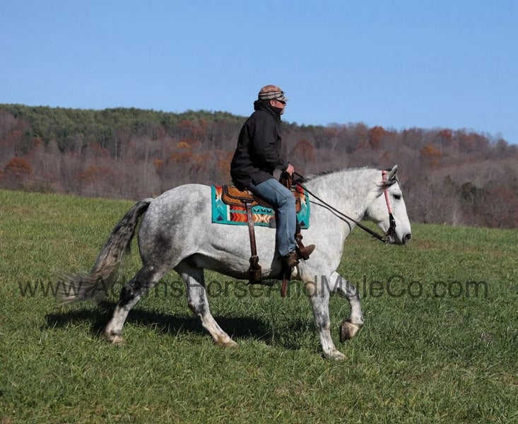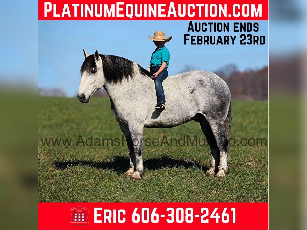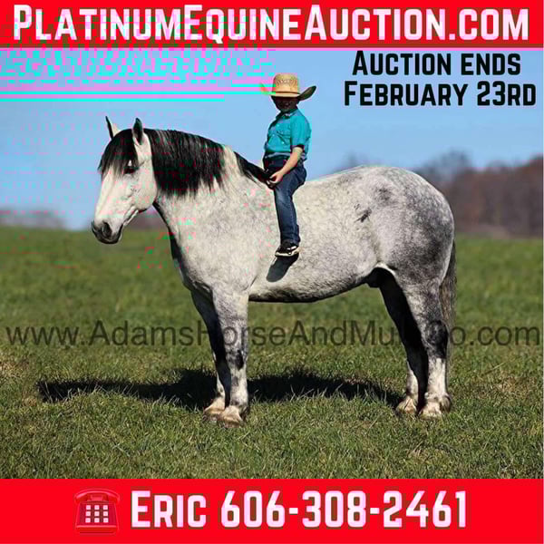 ONLINE AUCTION Place your bids at www.PlatinumEquineAuction.com Starting Bid $3500 Auction ends February 23rd, 2025 Need a new saddle? Check out White Rock Saddles on our website or Facebook! Tiny is a magnificent looking 16H+, dapple grey Draftcross gelding that is weighing in around 1450lbs and has dapples the size of apples! He is 9 years old and is a sturdy built horse. Tiny is one that does a little bit of everything! He is very well harness broke, pulls all farm implements and carriages as well. He’s been ridden around the ranch, checked cows and rode fences. Tiny is a slow and laid back type of horse that will just ease along down the trails with no hesitation. He is a horse that the whole family will love and one that will help build everyone’s confidence levels! He has been camping in several states and has been ridden by all ages of beginners. When out on the ranch or going down the trails he will cross creeks, ditches, logs and navigate rough rocky areas. He is safe in traffic safe whether that be trucks or cars. He has a nice jog, his lope is smooth as well and he lopes nice circles! He has been exposed to all kinds of wildlife such as deer or turkey. If you are a big ol feller, a lil bitty lady or a combination of each… Tiny will take care of you! Feel free to call Eric 606-308-2461 with any questions or to make a Buy It Now Offer! Tiny is Located in Mt. Vernon, KY. ONLINE AUCTION Place your bids at www.PlatinumEquineAuction.com Starting Bid $3500 Auction ends February 23rd, 2025 Need a new saddle? Check out White Rock Saddles on our website or Facebook!