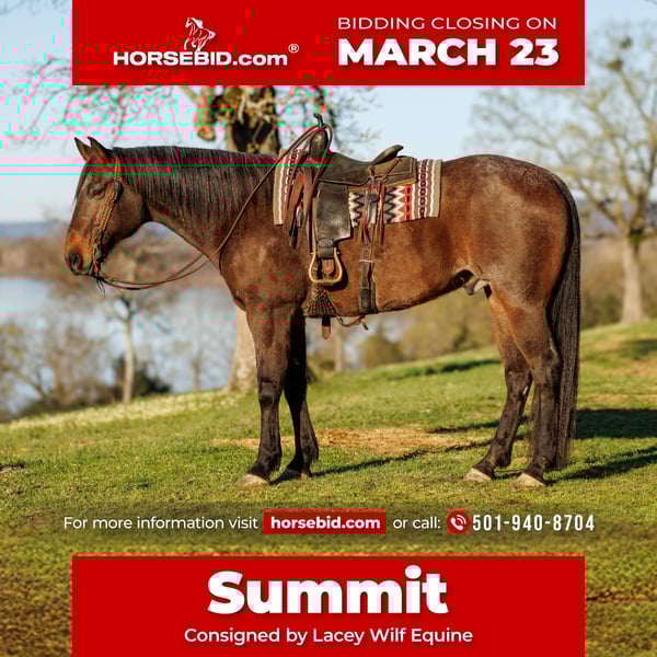 ⚜️𝓽𝓱𝓮 𝐆𝐎𝐋𝐃 𝓢𝓮𝓵𝓮𝓬𝓽⚜️ Happening now thru MONDAY | MARCH 23rd - Available EXCLUSIVELY on HorseBid's website! For more details and to register visit: www.Horsebid.com CONSIGNOR CONTACT: Lacey Wilf Equine 501-940-8704 LOCATION: Quitman, AR BREED: Draft Cross REGISTERED: No COLOR: Bay Roan HEIGHT: 17.2 AGE: 11 GENDER: Gelding Summit is the kind of horse that gets noticed the moment he walks into the picture. Standing an impressive 17.2 hands, this 11-year-old bay roan draft cross gelding is built on a scale that is hard to come by, with the substance, bone, and presence to handle a job that would make lesser horses think twice. His size isn’t just impressive to look at, it’s useful. Summit was built to pack weight, cover country, and keep the same steady rhythm mile after mile. Outside, he’s the definition of a dependable trail partner. Summit travels out confidently, stays sure-footed in rough country, and approaches obstacles with the same steady attitude every time. Logs, water, steep ground, narrow ditches, or whatever else the path throws in front of him, he stays level-headed and keeps on marching. With his size, stamina, and unshakable confidence, he would be a valuable addition to any outfitter string looking for a reliable mount to guide hunts or carry riders comfortably through long days in the mountains. In the arena, Summit shows the same willing mindset. He rides English or Western, carries himself comfortably, and works off a true one-hand neck rein with a simple, honest feel. He’s been well exposed to cattle, helping gather, check fences, push pairs, and work gates without fuss. Around the barn, Summit is the easygoing type that fits right into everyday life. He’s comfortable stalled or turned out with other horses, stands quietly for grooming and saddling, trailers well, and handles the regular routine without any drama. Despite his towering height, he’s especially patient when it’s time to get on. He’ll stand steady for mounting… even if getting aboard means you have to crawl halfway up his side to do it. Big horses can be hard to find. Big horses that are honest, useful, and agile are even harder. Summit is the kind that checks all three. Watch his full Youtube video, feel free to reach out with any questions, and arrange a visit or a FaceTime with Summit!