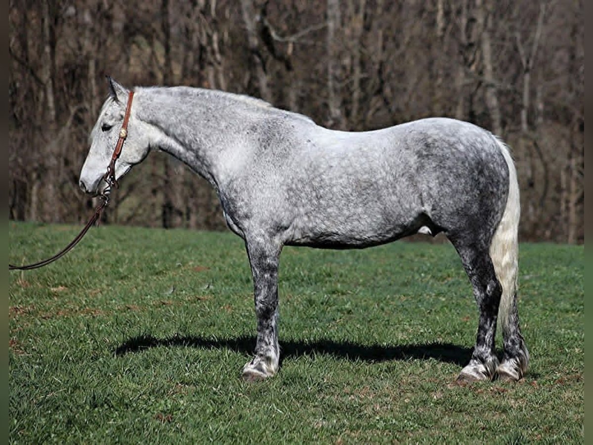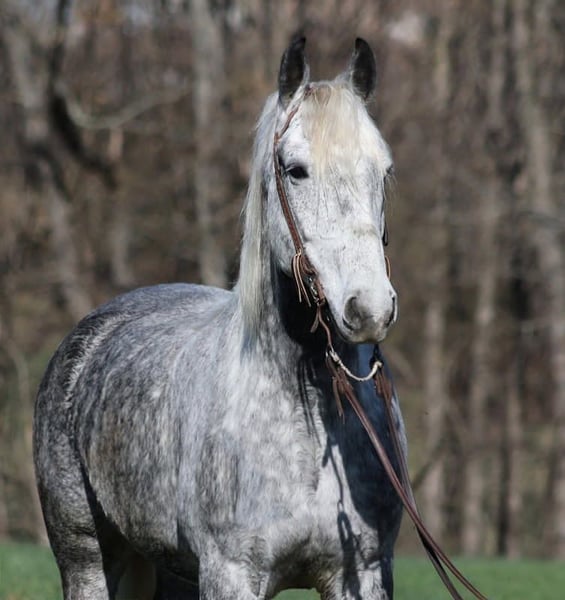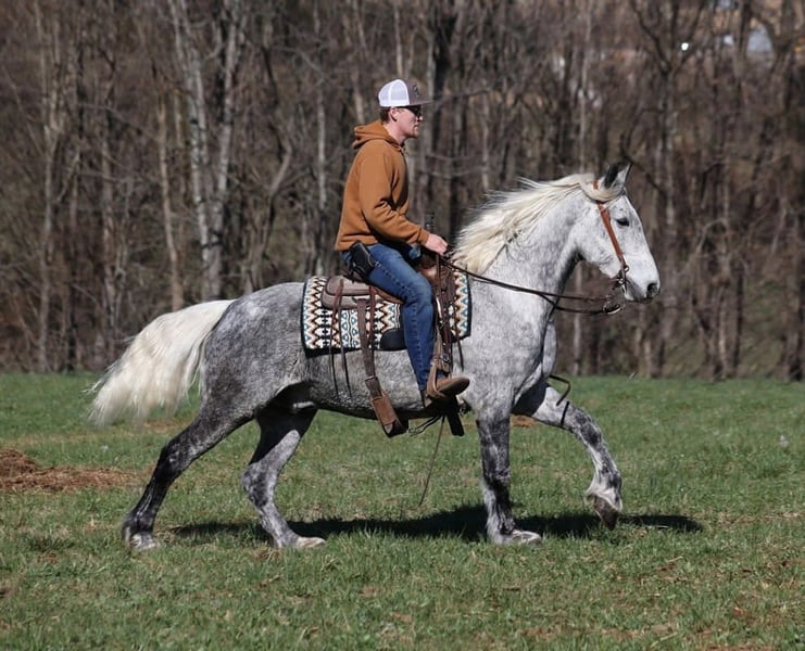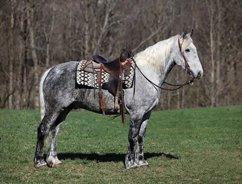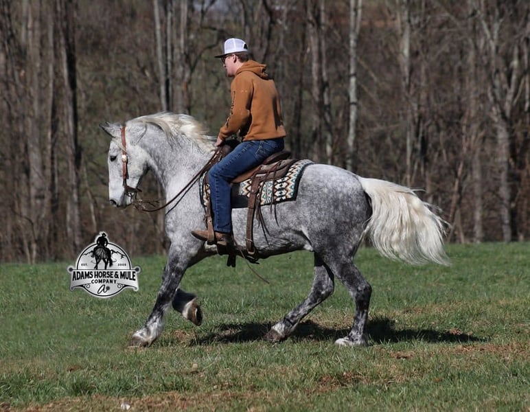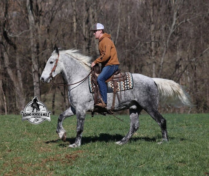 "AVAILABLE ON ONLINE HORSE AUCTION AT www DOT PlatinumEquineAuction DOT com BIDDING OPEN NOW thru SUNDAY | APRIL 19TH! *Final price will be determined on auction site* CONSIGNOR CONTACT INFO: Adams Horse & Mule Co. 606-308-2461 LOCATION: Mt. Vernon, KY All Smoked Out has Dapples the size of apples! Just try to count the dapples on this guy! Smokey is a stout built draftcross gelding standing around 15.2hh, he will weigh 1250lbs, he is 9 years old, and he is that super pretty dapple grey coloring with a silver mane and tail! He is one cool looking guy! Not only does he look cool, he is has all of the other boxes checked as well… he is Mr. Personality, as friendly as they come, loves attention and is very calm natured. Smokey is out of the same breeding program as several other top draftcross geldings that we have had over the last 4 years and every one of them has the right mind with the calm nature that makes them great family horses. Smokey has been in our program since last year and has completed the natural horsemanship training and does liberty work and he also knows some tricks, he will bow, lay down and set on his rump. Smokey is great on trails and he will cross creeks, ditches, logs and navigate rough rocky areas. He has a smooth jog, a VERY VERY nice easy to set lope, a good stop, turns a circle both ways and backs with ease! He has been exposed to all kinds of wildlife such as deer or turkey or other animals like cows or dogs and will go anywhere that he is asked too. He has been rode many miles in the mountains of Eastern Kentucky and encountered every obstacle possible on the trail. He will go up or down even the steepest slopes, across deep creeks, over downed trees, and over all types of rough terrain while still being sure footed. Smokey is not cinchy, cold backed, does not crib or weave. In addition to riding, Smokey has also been driven down the highways as well. Smokey is a super cool horse that anyone is sure to love!!! Feel free to call Eric 606-308-2461 with any questions.