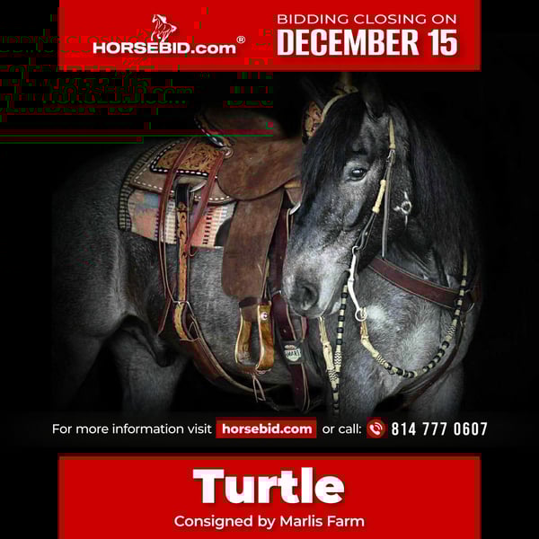🎄𝐓𝐇𝐄 𝑯𝒐𝒍𝒊𝒅𝒂𝒚 𝐂𝐋𝐀𝐒𝐒𝐈𝐂🎄 Happening now thru MONDAY | DECEMBER 15th - Available EXCLUSIVELY on HorseBid's website! For more details and to register visit: www.Horsebid.com CONSIGNOR CONTACT: Marlis Farm 814 777 0607 LOCATION: Rebersburg PA BREED: Crossbred REGISTERED: No COLOR: Blue roan HEIGHT: 14.3 AGE: 4 GENDER: Gelding Turtle as we call him is a 4 yr old 14.3 hand 1/4 draft / 3/4 quarter horse that is well broke and has the prettiest color you could put on one. He rides english or western and has 3 smooth comfortable gaits and has a good stop. Turtle rides good in and out of the arena , he picks up both his leads and rides well off leg pressure. Turtle neckreins, sidepasses and is a seasoned trail horse. He rides out alone or in a group and goes wherever you point him with no issues, he goes over logs, through water and we have taken him down the main highway into town and he doesnt mind all the traffic and commotion. We have taken Turtle to state parks for day rides and he is used to bikes and all the ppl and dogs. Turtle is athletic and loves to jump. Turtle is fun to ride and always willing to please, we have also used him to check fences and push cattle here on the farm. He loads and unloads and also stands to be tacked, washed and stands for the farrier. Turtle does well inside and turned out in a mixed herd. For more info or to come meet him call Mark 814 777 0607 (call only) We can help arrange shipping anywhere!!