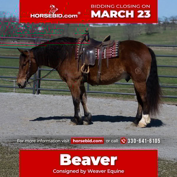 ⚜️𝓽𝓱𝓮 𝐆𝐎𝐋𝐃 𝓢𝓮𝓵𝓮𝓬𝓽⚜️ Happening now thru MONDAY | MARCH 23rd - Available EXCLUSIVELY on HorseBid's website! For more details and to register visit: www.Horsebid.com CONSIGNOR CONTACT: Weaver Equine 330-641-6105 LOCATION: Fredericksburg OH BREED: Draft cross REGISTERED: No COLOR: Bay HEIGHT: 16.1 AGE: 5 GENDER: Gelding Meet Beaver! The biggest puppy do you'll ever own! Though he is a big, stout 16.1hh, he is a true puppy at heart. What he loves most is his rider, and he will do his very best to please! Beaver is a great rider! He will walk, trot and canter easily. He will lope a circle nicely. Picks up both leads correctly. He rides well under both English and Western disciplines. Beaver will neck rein, sidepass, cross obstacles, stop and back up easily and so much more! He will stand nicely at a mounting block. He has been ridden out on the trails, as well as on the roads. Beaver is 100% traffic safe. He is an absolute sweetheart in the barn as well. He is easy to catch and bridle. He will ground tie, as well as stand in cross ties. He will pick up all four feet nicely. He will stand to groom, tack, bathe, and for the farrier. He does well out with other horses. Beaver will also Trailer load well. He is a pretty individual with a huge personality. No maintenance. 100% sound. PPE are available. Hauling can be arranged as well. Feel free to reach each and we will happily assist you! We look forward to hearing from you! (Linda) 330-641-6105