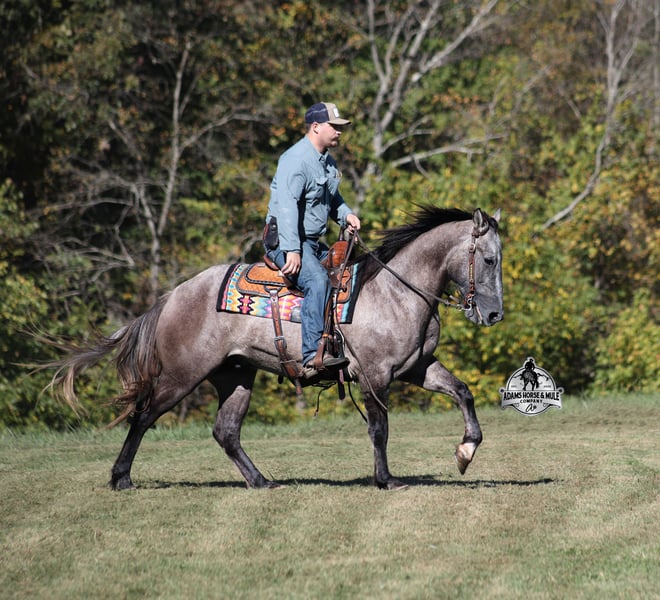 Go to visit our website for more pics and a video www.AdamsHorseAndMuleCo.com AHAMC has been in the horse business and sold horses over the internet since 2005. We have a long track record of success with hundreds of happy customers. We work hard to match riders with the correct horses and specialize in beginner safe, family friendly horses that have been used and checked out by our family! We can set up transportation anywhere in the US and look forward to working with you.If your confidence levels are low and you have had nothing but bad luck with you other horses… just say goodbye to those days because Ashton is going to fix all of that! Ashton is a beautiful grey/dun Gelding that is very stocky built, he is 5 years old, is standing 15hh and he has the coolest tiger stripes on his legs and dorsal stripe down his back! He is 3/4 Quarter Horse and 1/4 Percheron Ashton has completed the natural horsemanship program and he is very friendly and loves attention!! He knows some tricks as well as he will lay down on command. Ashton has done it all from being ridden by small children down the highways to being ridden around the ranch, checked cows, rode fences and cruised the trails. He has been used at brandings and drug calves to the fire and has been pasture roped off of as well. He is a laid back type of guy that will just plod along down the trails with no hesitation and not in a hurry. He has been on camping trips and has been ridden by all ages of riders from 6 to 86 that guy will be safe and easy to ride. When out on the ranch or going down the trails he will cross creeks, ditches, logs and navigate rough, rocky areas. He is safe in traffic whether that be trucks or cars. He walks on a loose rein, has a nice jog, his lope is slow and collected plus he lopes very nice circles on a loose/draped rein! Our kids have ridden him bareback around our arena, taken him bareback down the trails and through the creeks… this horse is the ultimate family horse! He has been exposed to all kinds of wildlife such as deer or turkey. He is athletic and would be a great horse to put under English tack to go over the rails with. He pastures well with others and rides the same after time off. Ashton is one that the whole family will love, he will be perfect for the guest to ride as he will build his riders confidence, with a personality that will make him everyone’s best friend! Feel free to call Eric 606-308-2461 with any questions!