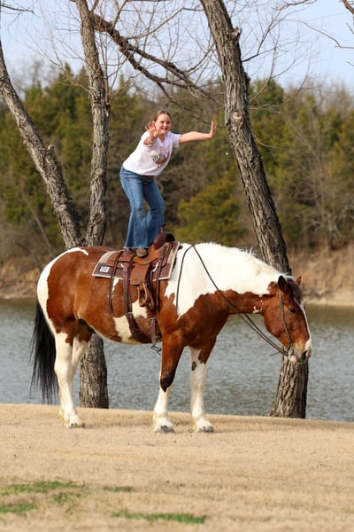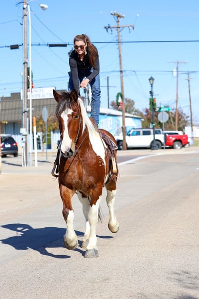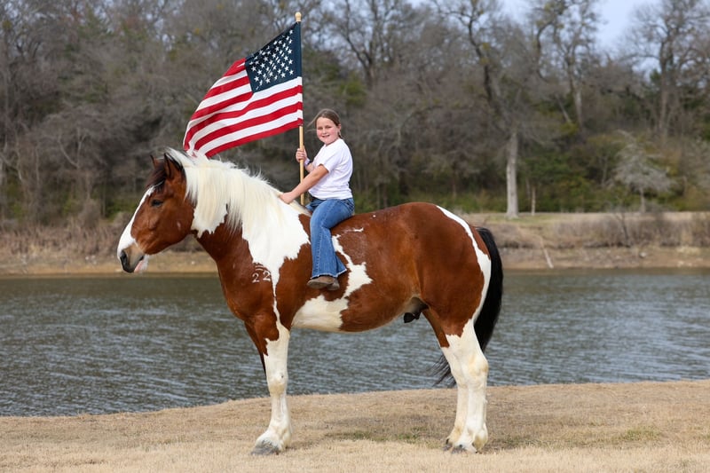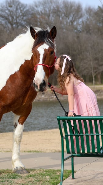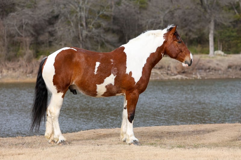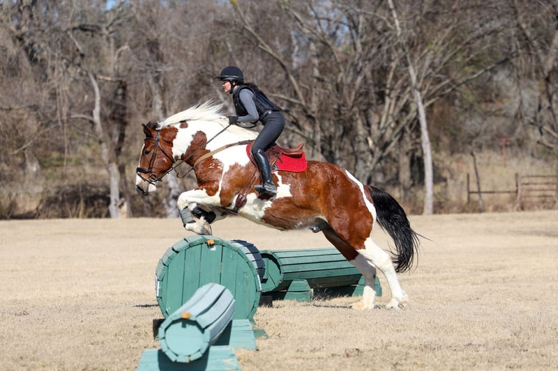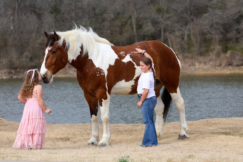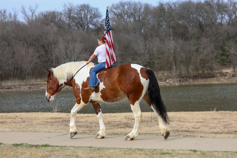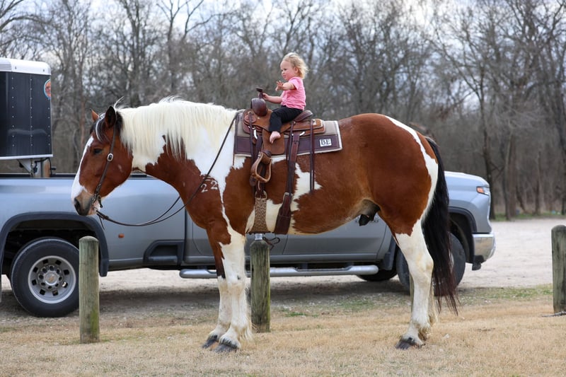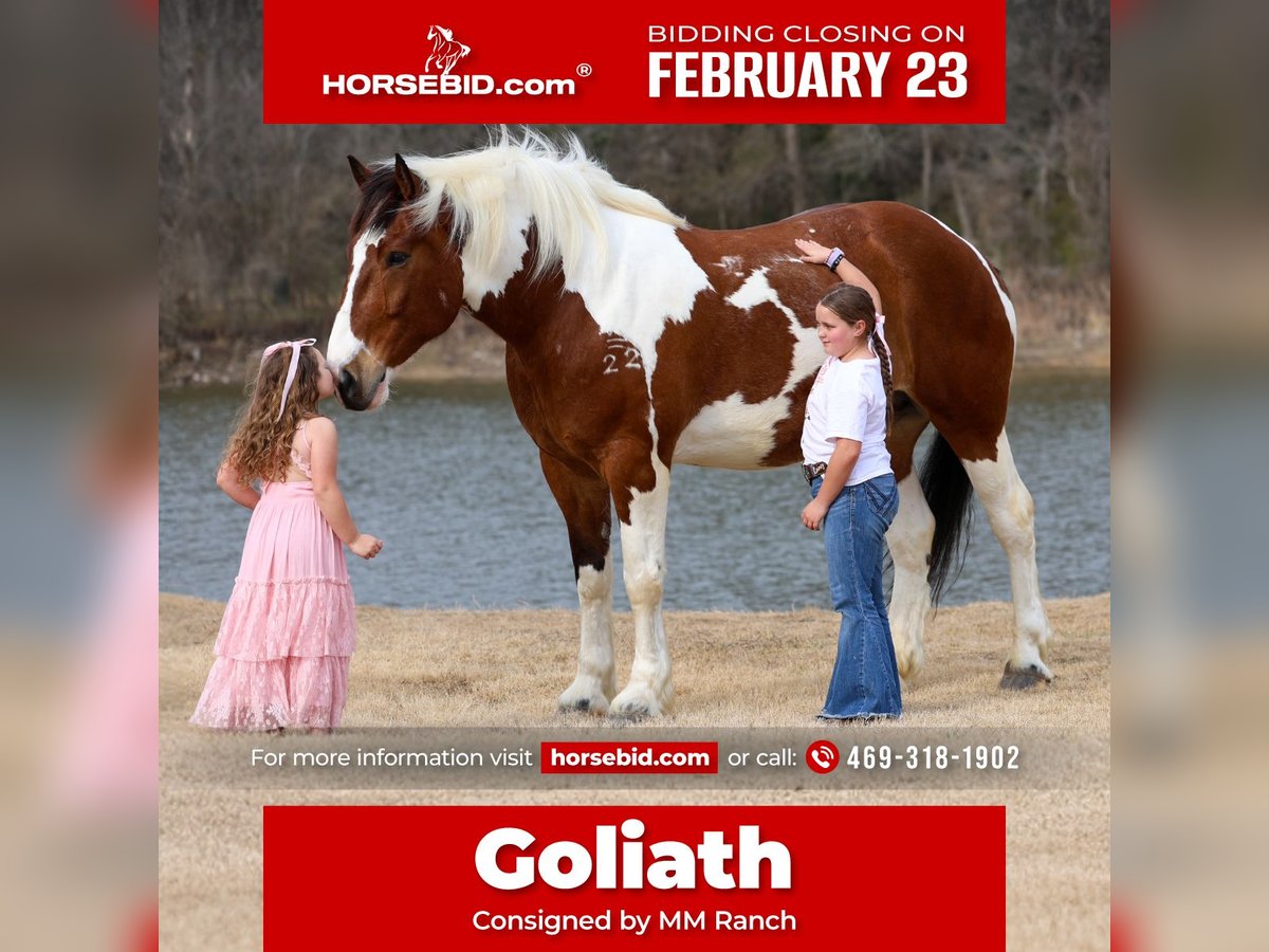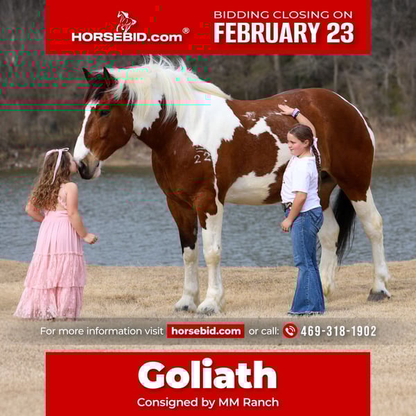 💎 𝐓𝐇𝐄 𝓓𝓲𝓪𝓶𝓸𝓷𝓭 𝐒𝐇𝐎𝐖𝐂𝐀𝐒𝐄 💎 Happening now thru MONDAY | FEBRUARY 23rd - Available EXCLUSIVELY on HorseBid's website! For more details and to register visit: www.Horsebid.com CONSIGNOR CONTACT: MM Ranch 469-318-1902 LOCATION: Forney, TX BREED: Crossbred Paint Draft REGISTERED: No REGISTERED NAME: Goliath COLOR: Paint HEIGHT: 18 AGE: 6 GENDER: Gelding !!Meet Goliath!! This is one unbelievable one of kind horse!! Although he is a giant, he has the demeanor of a miniature pony!!! Absolutely as gentle and sweet as puppy!! To know him is love him!! He draws a crowd everywhere he goes and he loves it. If you are looking to save money and just buy one horse for the whole family this is the one to buy. The whole family can ride him at once. No joke. He can easily carry 3 people. Goliath is a paint 18 hand tall crossbred gelding. Yes, 18 hands tall and 4 ft wide. He is quite a large animal. But he truly acts like a pony. He loves attention. He will walk right up to you in the pasture and he wants you to catch. He literally begs you to catch him. He loves being around his people. He will gladly leave his pasture mates to hang around his people and go on adventures. I can’t say that enough. He truly loves being around people and getting all the attention. Seriously you cannot walk out to the pasture without him being in your pocket and wanting to follow you everywhere you go. A true definition of a in your pocket type. Come meet him and you will see. Goliath is just 6 yrs old. Yes just 6. He has his whole life ahead of him. But has the experience of a 20 yr old horse. He has already had so much real world experience. When Goliath came to us, he came off a big ranch in Wyoming. Where he was being used like a ranch horse. They used him like a regular quarter horse. He doesn’t know he is big or different. They really got him broke. They did all the chores on him. From pulling a hay wagon to put out hay. To riding out on the ranch to check cattle. To packing supplies up into the mountains. Even has been roped off of. He is what I would call an all around seasoned trail horse that has seen a lot extensive country. Been in the steepest parts of the mountains. He can handle any terrain. Loves to cross water (so he can play in it). Has had a gun shoot off of him and around him. Used durning hunting season as well to pack out deer and elk. He can carry several at time. He is been there done that type. Has had lots of mileage put on him. When Goliath came to us we started his jumping career. We seen he had so much talent and ability. He loves the cross country courses. The bigger the jumps the better. He is like a little kid and loves to see all the different jumps. It’s like play time to him. He has beautiful form and keeps the same steady rhythm coming in, over, and away from the jumps. He is not a lazy horse and not a hot hyper horse - he falls right in that perfect in-between, making him incredibly easy and confidence-building to ride. Everyone absolutely loves to ride him because he does not require constant kicking and easy to get into that slow lope on the course. Now he is not going to win any speed races but dang sure has the ability to do so. I have seen him run up for dinner. He can really run and cover some ground when he wants to or when food is involved. For a big horse he has the smooth trot and lope. Has a lot of handle. Neck reins perfectly. Backs. Side passes. Really broke and soft in the bridle. Responsive to all cues. Whether on his back or on the ground. You don’t have to pull hard. He is very lite both in his mouth and on his sides to give cues. We just ride him with simple short shank snaffle or an o-ring snaffle. He doesn’t need a heavy bit. He is also aware and cautious with his surroundings. Our little sweet 12 lb puppy is always running around his feet. Also the kids. He makes sure to not step on them. Loves smelling of the puppy and following him around to see what he’s doing. It truly is amazing to see such a big horse with such a heart of gold. He truly is the sweetest most kindest natured soul. I would absolutely say Goliath is suitable for any age or riding experience. He is 100% safe. Absolutely no bad habits or quirks about him. You don’t have to know anything special to own him. He is easy to be around and especially to handle. I think he would make an excellent mount police horse. He has so much experience and patience that would make him perfect for those situations. Nothings scares him. Not all at spooky or reactive. He is experienced around being in town around traffic and all the excitement. Goliath doesn’t require anything special. We use our regular saddle and girts on him. For as big as his head is he can wear our standard quarter horses headstall and bits. We didn’t have to get anything extra or special for him. We did have to let it out. But it all fits him. He is such an easy keeper. Easy to shoe if you want to put shoes on him. However he doesn’t need them. He has excellent hooves. He is sound in every way. Absolutely healthy. Nothing wrong with him. We did have a pre evaluation done on him by our vet. (Will include in the pics). Horses like Goliath are few and far between. Your neighbors won’t have one like him. You will stand out riding him. Call us if you would like anymore info about him. We have owned and loved this big guy. We would love to tell you about him. We would be happy to help you arrange shipping on him anywhere. He is super easy to load and haul. 🌟Recap: Pulls a wagon Rides English and western Jumps cross country Beginner safe Absolutely no bad habits One of a kind Packs Shoot a gun off him Ride him triple Sound Healthy Just 6 years old Broke