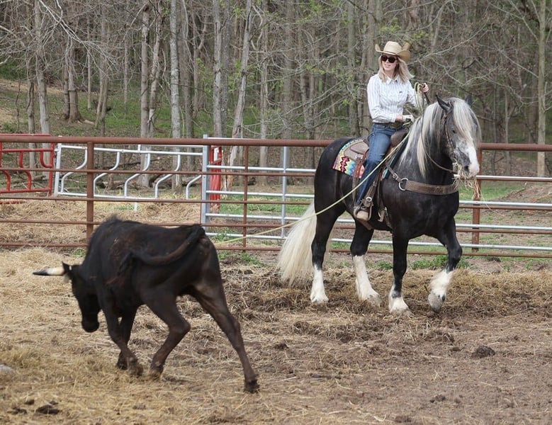 Consigned to Cowgirl Cadillacs in Sheridan, WY. Sales June 14-15th. You can bid online, phone bid or bid in person! With movie star good looks, muscles upon muscles and that long flowing hair you’d expect to see Slate on a Hollywood movie screen. Slate a stout built, 16H, 6 year old, grey tobiano draft-cross (paint/ quarter horse/ percheron) gelding that stands 16H tall. He is trained to lay down and sit, on command. Slate is everyone’s best friend and he loves attention. He has been used around the ranch and can pull anything that you can throw a loop on. If a mad momma cows pushs on him, he will just stay calm and push right back. The kids have ridden him around the ranch and checked cattle on him. He has seen the bright lights, heard the loud speakers and the roar of the crowd at the rodeo while shagging bulls from the arena. He has also been drove down the highways under harness and is traffic safe. Slate has a smooth jog, takes his leads and will lope as soft and slow as horses half his size! He has a good stop, sidepasses to open/shut gates and backs with ease. Slate has been exposed to all kinds of wildlife, he has been used in the mountains for hunting and has packed game. Slate is great on the trails, he picks his way through rocky terrain, crosses deep water, scales slopes with ease and walks across deadfall as well. If you need to feel safe and secure just hop on Slate and enjoy the ride, you will soon see that there is a lot more to this guy that what meets the eye! Call 606-308-2461 for more info.