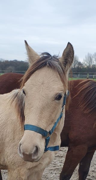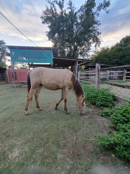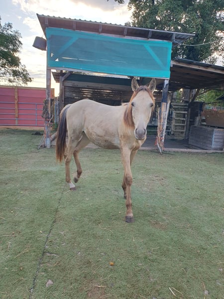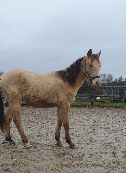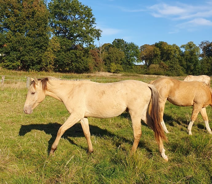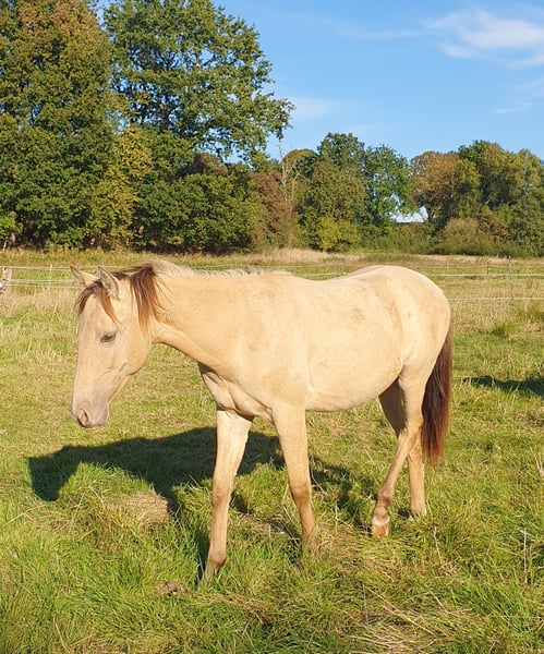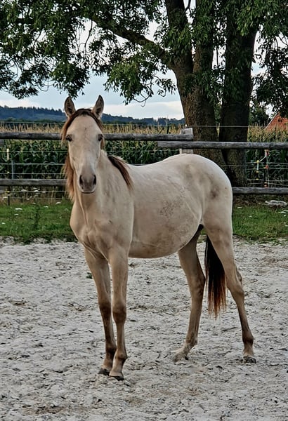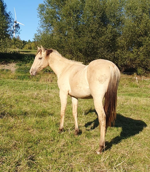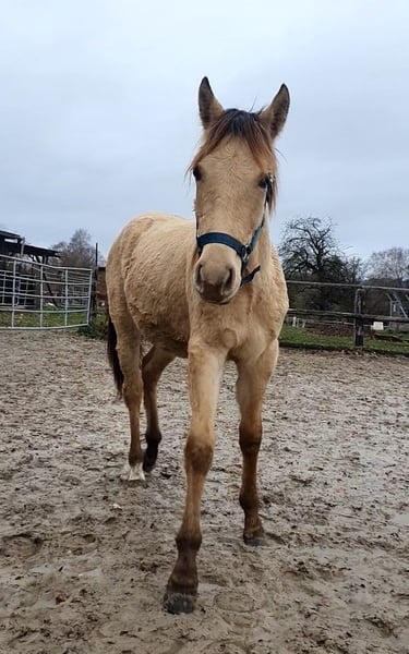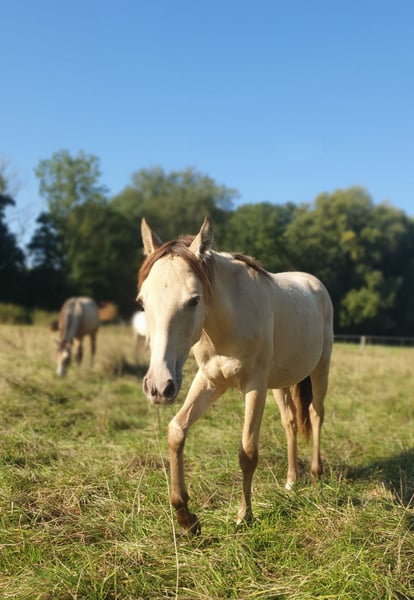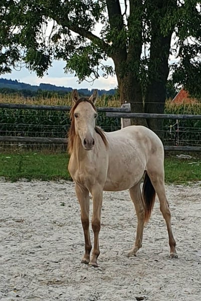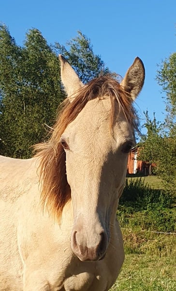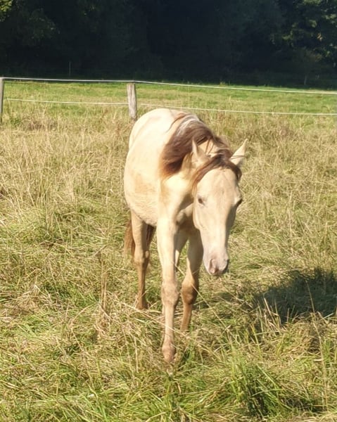 One-year-old Azteca stallion in the special color Amber Champagne Dun for sale. This one-year-old Azteca stallion is a true eye-catcher, not only because of his pedigree (Lusitano x Paint Horse) but also due to his rare special color Amber Champagne Dun. His golden shimmering coat makes him a unique specimen. But he is more than just beautiful: he is an alert, friendly, and curious young horse who impresses with his excellent basic gaits and a lovely natural balance. These qualities make him an ideal candidate for Working Equitation, as well as for Western riding and as a versatile leisure partner. He is healthy, well-socialized, and ready to be developed by you. Key data: Breed: Azteca (Lusitano x American Paint Horse) Age: 1 year Gender: Stallion Color: Amber Champagne Dun Potential: Working Equitation, Western, leisure Expected height: approx. 1.57 m He could also remain for further upbringing and will only be sold to a suitable home.