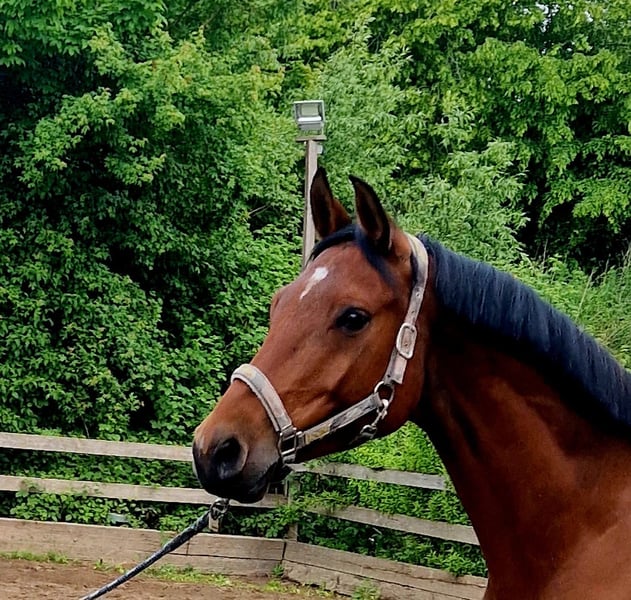 Chubacca, 6 Jahre, ca. 1,65 m, wird bevorzugt als Zuchtstute oder an erfahrene Freizeitreiter abgegeben.(Chacco Blue Nachkomme) Sie ist im Umgang lieb, verschmust und artig, kennt Trubel aus einer kleinen Ponyreitschule, ist jedoch schreckhaft und braucht einen ruhigen, souveränen Reiter, der ihr Sicherheit gibt. Kein Anfängerpferd. Ausbildungsstand eines Jungpferdes, benötigt Zeit, Geduld und regelmäßige Arbeit, da sie schnell abgelenkt ist. Ausreiten in Begleitung oder als Handpferd geht, alleine muss noch geübt werden Wurde als Springpferd gekauft, mag aber keine Sprünge. Kennt Halle , Außenplatz, auswärtige Hallen oder Plätze, Equikinetik, Longe, Horsemanship , Ausritte. Fährt Anhänger mit einem Begleitpferd, lässt sich dabei alleine auf und abladen Gesundheit: Chip-OP im Sprunggelenk (01/2025), Nachspülung erfolgt, alles verheilt. Allerdings bleibt das Gelenk dauerhaft etwas dicker (nur optischer Mangel). Regelmäßig betreut durch Huforthopäden, Osteopathin und Schmied sowie Zahnarzt. Turnier-geimpft inkl Herpes . Haltung: Sommer 24/7 Koppel, Winter Offenstall + Heulage ad libitum. Hier eher ranghoch, steht aber auch fast nur mit Ponys zusammen. Abgabe nur in erfahrene Hände oder als Zuchtstute. Standort: 24223 Schwentinental (Kreis Plön)