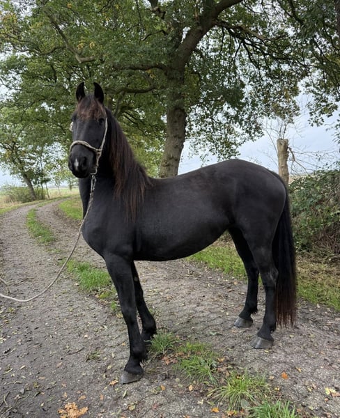 Hier ist die niederländische Übersetzung des Textes: --- Ik bied hier mijn 4-jarige drachtige merrie te koop aan. Ze is geboren in het voorjaar van 2021. Het paspoort is aanwezig. Ze is een rustige, vriendelijke merrie. Ze kent alle mogelijke boerderijdieren, de hoefsmid en het vervoer per trailer vormen geen probleem voor haar. Daarnaast is ze een zorgzame en goede moeder, aangezien ze al zonder complicaties een veulen heeft grootgebracht. Ze is opnieuw drachtig van een sportieve Fries hengst. Haar zeer expressieve gangen kunnen op verzoek per video worden toegestuurd. Wat rijden betreft, staat ze nog open voor alles. Bij serieuze interesse graag contact opnemen: 015221813857