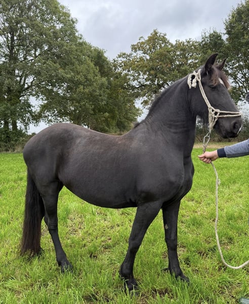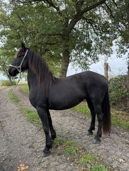I am offering my 4-year-old pregnant mare for sale. She was foaled in spring 2021. Her passport is available. She is a calm and friendly mare. She is familiar with various farm animals, the farrier, and traveling in a trailer is no problem for her. Additionally, she is a caring and good mother, having raised one foal without any complications. She is currently in foal again to a sport-oriented Friesian stallion. Her highly expressive gaits can be sent via video upon request. She is still open to further training and riding. Please contact me if genuinely interested. Phone: 015221813857