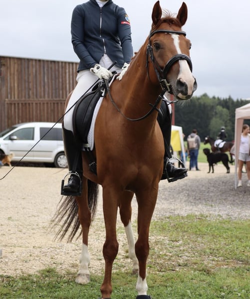 Sunny ist ein hübscher, aufgeweckter Wallach, der Dressurtechnisch auf L/M Niveau (Traversalen, Galopp-Seitengänge funktionieren gut, leichte Pirouettenansätze sind zu erkennen) und im Springen bis L ausgebildet ist. Er arbeitet gern und braucht einen einfühlsamen und konsequenten Reiter und Freund, der Lust hat, sich mit ihm zu beschäftigen und Zeit zu investieren. Diese Zeit habe ich momentan leider nicht, da ich mich im Abistress befinde und voraussichtlich danach studieren werde, das heißt ich werde ihm nicht gerecht werden. Mit anderen Pferden ist er äußerst umgänglich und nicht dominant, kann also sowohl mit Stuten, als auch mit Wallachen gemischt auf der Koppel stehen und genießt die sozialen Kontakte. Er wurde immer abwechslungsreich bewegt (Platz, Halle, Gelände). Leider muss er momentan pausieren aufgrund einer Verletzung vor 5 Monaten. Im Moment befindet er sich im Schrittaufbau und geht 1-1,5h pro Tag Schritt und der Tierarzt ist sehr zufrieden mit der Heilung. Während der ganzen Zeit wurde eine gewissenhafte Therapie durchgeführt und bei der letzten Tierarztkontrolle im November war er auch schon komplett lahmfrei. Sunny sollte trotzdem noch einige Zeit nur Schritt gehen und dann kann das Training langsam wieder aufgebaut werden. Er ist natürlich brav beim Hufschmied, Verladen ist auch kein Problem und er war schon oft auf Turnieren oder Lehrgängen unterwegs. Dass Impfungen und Wurmkuren regelmäßig durchgeführt wurden, ist klar. Wichtig: er kann zur Zeit nicht probegeritten werden. Reitvideos sind aber vorhanden und können auf Nachfrage hin angeschaut werden.