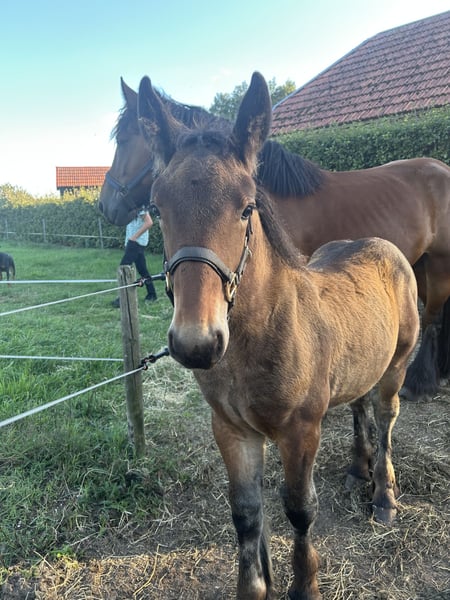Te koop Prachtig bruin trekpaard hengstveulen. Geboren in 2025, reserve kampioen op de veulenkeuring kvth. Braaf karakter.