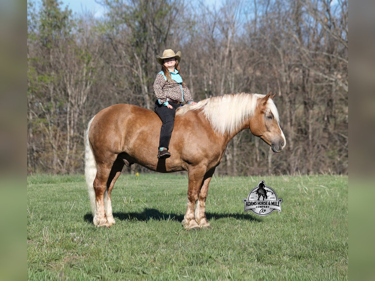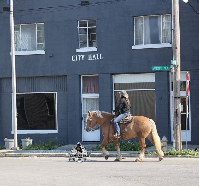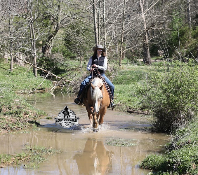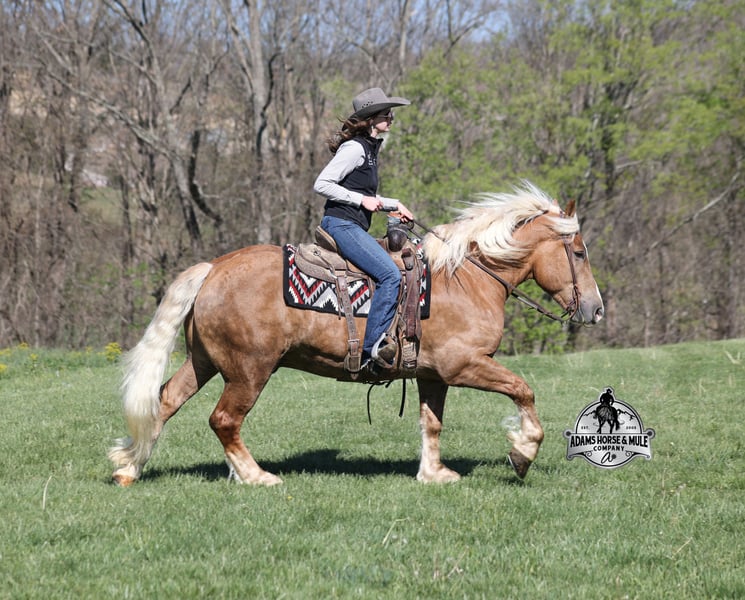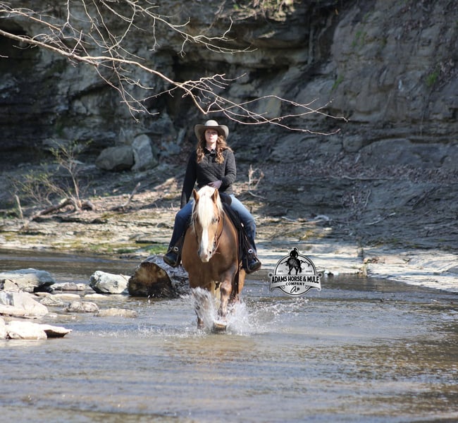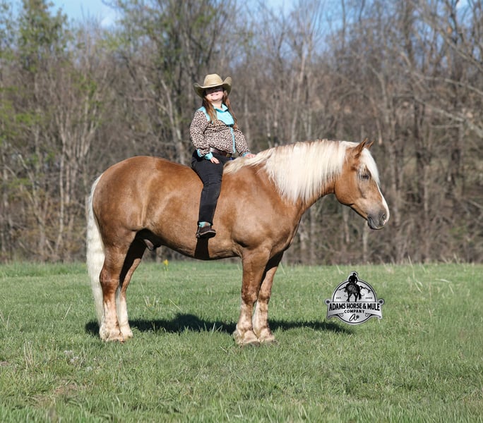 Go to visit our website for more pics and video link at www.AdamsHorseAndMuleCo.com AHAMC has been in the horse business and sold horses over the internet since 2005. We have a long track record of success with hundreds of happy customers. We work hard to match riders with the correct horses and specialize in beginner safe, family friendly horses that have been used and checked out by our family! We can set up transportation anywhere in the US and look forward to working with you. If your confidence levels are low and you have had nothing but bad luck with you other horses… just say goodbye to those days because your new Buddy is here! Buddy is a beautiful Golden Palomino/Blonde Sorrel Gelding that is very stocky built, he is 6 years old, is standing 15.2hh and he is a looker! He is a draftcross horse that has completed the natural horsemanship program, is very friendly and loves attention!! He knows some tricks as well as he will lay down on command. Buddy has done it all from being ridden by small children down the highways to being ridden around the ranch, checked cows, rode fences and cruised the trails. He has been used at brandings and drug calves to the fire. He is a laid back type of guy that will just plod along down the trails with no hesitation and not in a hurry. He has been on camping trips and has been ridden by all ages of riders from 6 to 86 that guy will be safe and easy to ride. When out on the ranch or going down the trails he will cross creeks, ditches, logs and navigate rough, rocky areas. He is safe in traffic whether that be trucks or cars. He walks on a loose rein, has a nice jog, his lope is slow and collected plus he lopes very nice circles on a loose/draped rein! Buddy is a great horse for the whole family! He has been exposed to all kinds of wildlife such as deer or turkey. He is athletic and does great under English tack and goes over the rails with ease. He is harness broke for all farm machinery and buggies. Buddy is one that the whole family will love, he will be perfect for the guest to ride as he will build his riders confidence, with a personality that will make him everyone’s best friend! Feel free to call Eric 606-308-2461 with any questions!